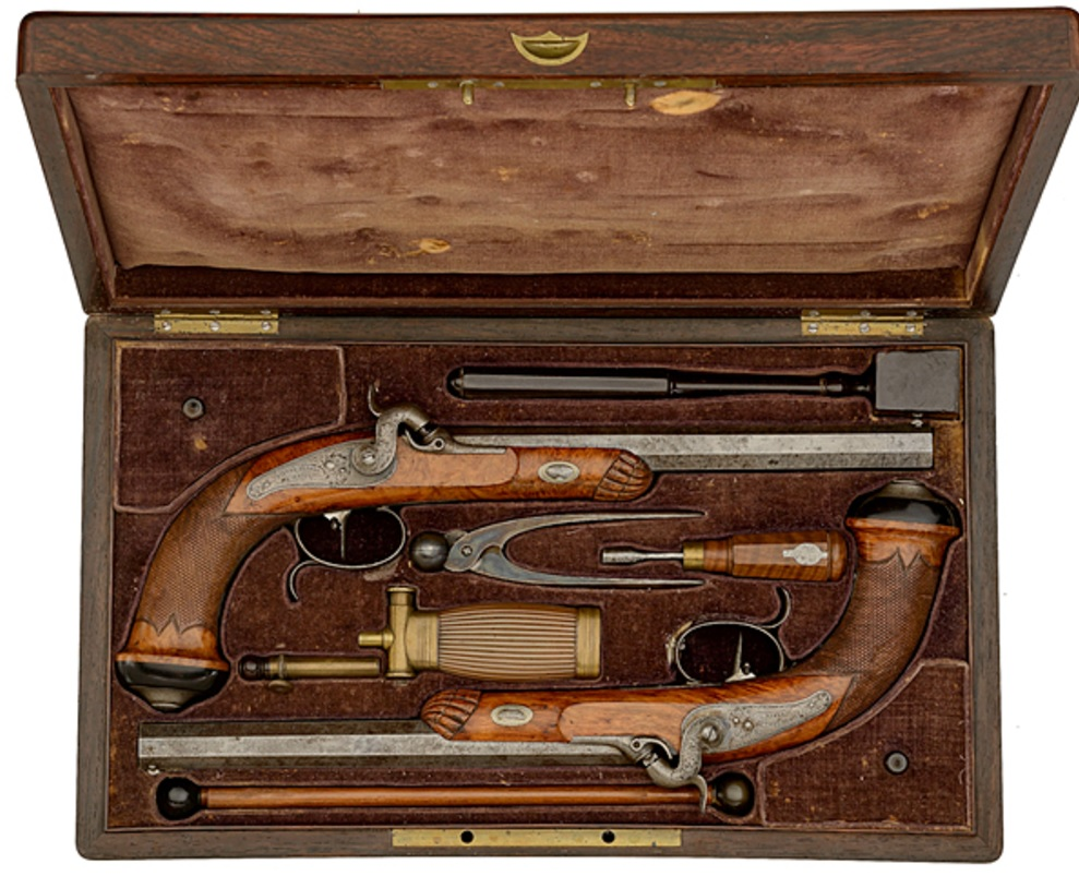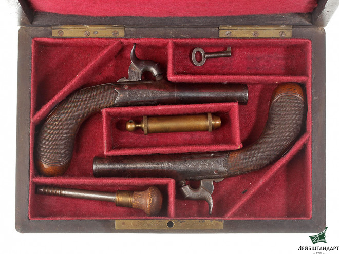 Дуэльные пистолеты — как братья-близнецы: одинаковый калибр, длина ствола, курки, ход спускового крючка и, естественно, отделка. У основания стволов таких пистолетов чаще всего выбиты цифры: «1» и «2» соответственно (выбор за участниками). Пистолеты помещались в специальную деревянную шкатулку, обтянутую изнутри бархатом или сукном. Ложемент в коробке удерживал пистолеты достаточно жестко, чтобы они не то что не болтались, но и не соприкасались друг с другом. В особых ячейках хранились пороховница с меркой (оружие было раздельного заряжания — кремневое либо, чуть позже, капсюльное), пулелейка (пули сферические — свинцовые шарики), шомпол для заряжания, насадка-экстрактор для разряжания (похожее на штопор приспособление для извлечения пули из ствола), отвертка (это ежели мастеру в починку нести), бывало — деревянный молоточек; в отдельных пеналах — небольшой запас готовых пуль и капсюлей (если пистолеты капсюльные).