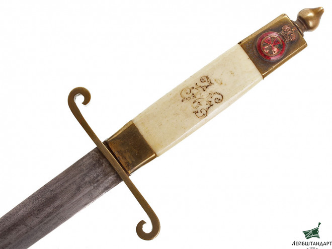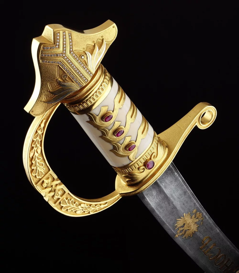 В 1788 году происходит важное изменение в наградной «оружейной» практике: происходит разделение наградного оружия на оружие с «алмазами» для генералитета, с добавлением при этом почетных надписей, и такое же без алмазных украшений для офицеров — Золотое оружие, также с почетными надписями. Постепенно относительно подробное описание отличий на эфесе заменяется лаконичной надписью «За храбрость», и уже в XIX веке Золотое оружие становится одним из самых почетных боевых отличий, мечтой каждого офицера. На протяжении всего столетия (а это столетие непрерывных войн) большинство экземпляров Золотого оружия — оружие без бриллиантовых украшений, предназначенное именно для награждения офицеров. Его вид постепенно регламентируется, и уже с 1844 года оно должно полностью соответствовать уставному образцу (оружие «старых образцов» разрешается носить лишь вне строя). Недавно в заметке, посвященной ордену Святой Анны, мы писали о его «младшей» степени: кавалер обязан был сам прикрепить к своему оружию знак ордена Св. Анны, такое оружие называлось Аннинским: вот непосредственная связь оружия и ордена. К слову, Золотое оружие считалось по статусу чуть ниже ордена Святого Георгия IV степени (с 1913 года в его Статут были внесены изменения и оно стало официально именоваться Георгиевским оружием). С этого же года к его эфесу крепился миниатюрный крест ордена Св. Георгия (ранее, в 1878 году, его было предписано носить на генеральском Золотом оружии, вне строя заменяющем бриллиантовое).