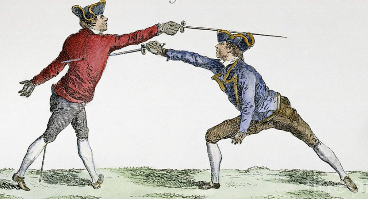 Но в данном случае мы говорим не о дворянах вообще, а лишь о той небольшой части, которой повезло нести службу при дворе. Шпага являлась неотъемлемым атрибутом костюма придворного. Умел ли он ей пользоваться? В большинстве случаев — да, и весьма неплохо. В 18 веке шпага является главным оружием дуэли: фехтовальное мастерство в сочетании с легким, прочным клинком позволяло решить любые вопросы чести.