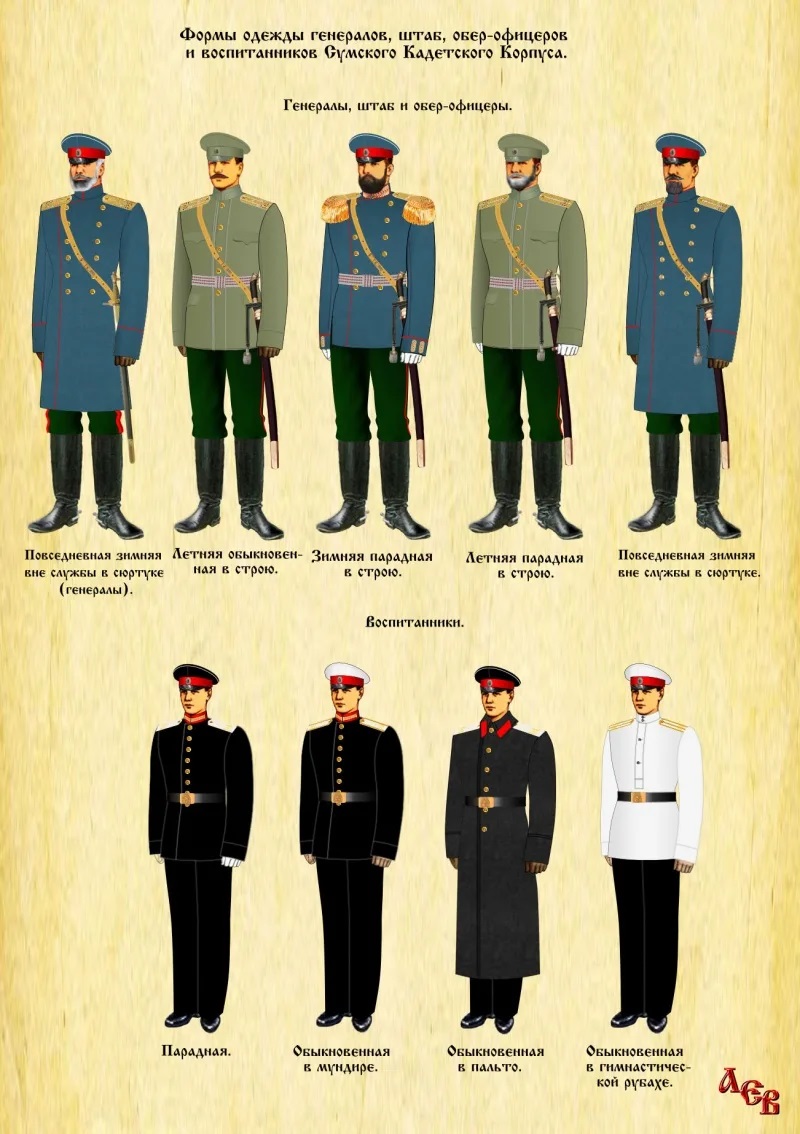 Поскольку Сумский кадетский корпус просуществовал недолго, он успел дать всего 11 полных выпусков. Директорами корпуса были генерал-майор Кублицкий-Пиотух Лев Иосифович (с 1900 по 1905 год) и генерал-лейтенант Саранчов Андрей Михайлович — до 1919 года. Обоих директоров выпускники вспоминали добрым словом, но именно Саранчову выпало руководить корпусов в эпоху не только Великой войны, но и Великой смуты. В начале 1918 года корпус был закрыт, но при гетмане Скоропадском открылся вновь. Помните «Белую гвардию» Булгакова? Корпус в это время представлял Киев в миниатюре: туда съезжались кадеты из множества закрытых корпусов со всей вчерашней империи. К середине 1919-го остатки личного состава были эвакуированы в Крым, и корпус перестал существовать. И в эмиграции бывшие кадеты и выпускники старались поддерживать друг с другом связь; кадетская взаимовыручка оказалась не пустым звуком.