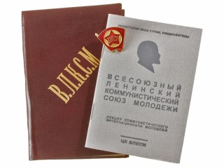 Комсомольский билет в обложке и значок ВЛКСМ времен Великой Отечественной войны. СССР, копия...