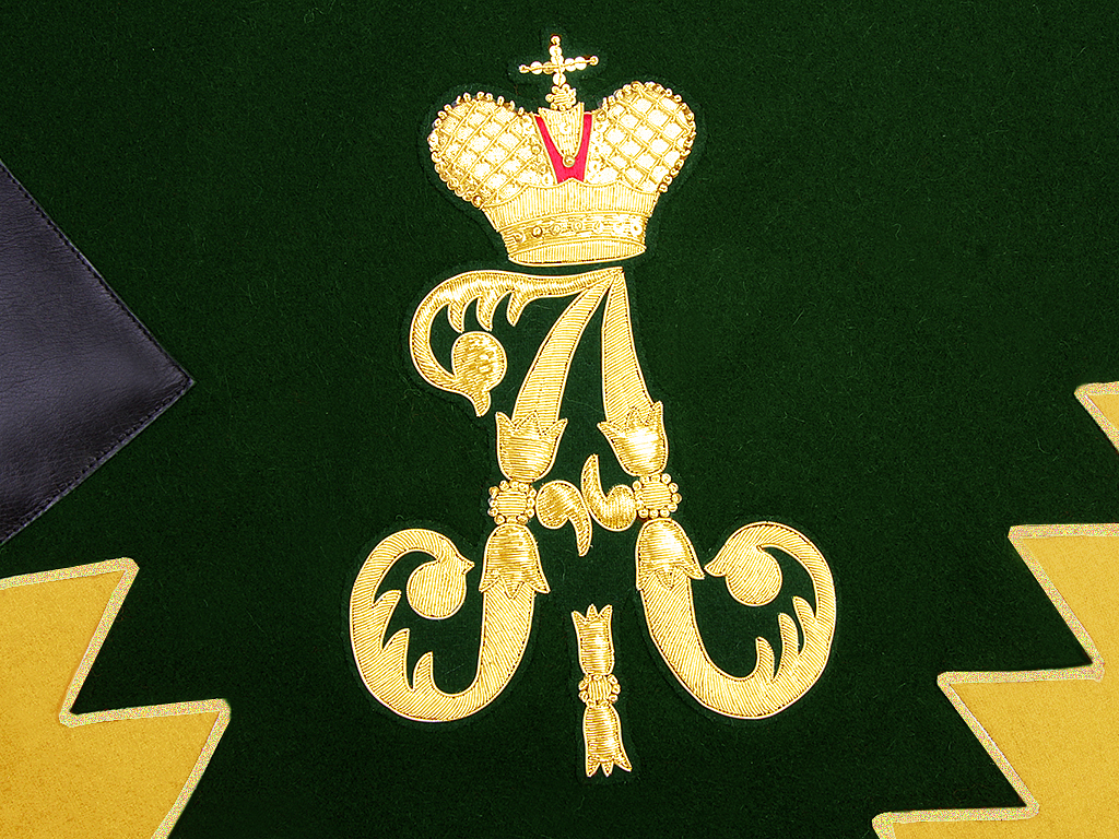 Шитый золотой  металлизированной канителью вензель Императора Александра, который нашит в задней (тыльной) части вальтрапа при изготовлении реплики выполнен различными видами канители и шелка.