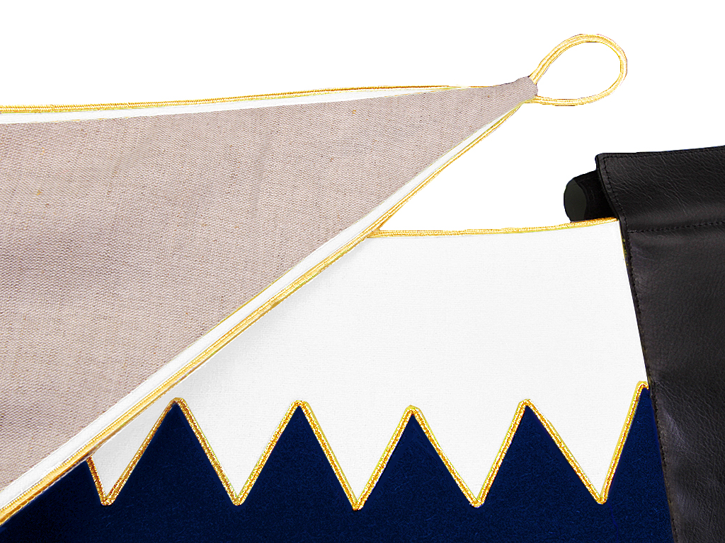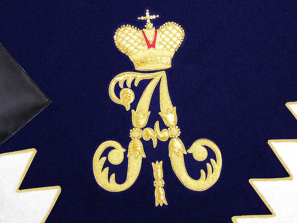 Шитый золотой металлизированной канителью вензель Императора Александра, который нашит в задней (тыльной) части вальтрапа при изготовлении реплики выполнен различными видами канители и шелка.