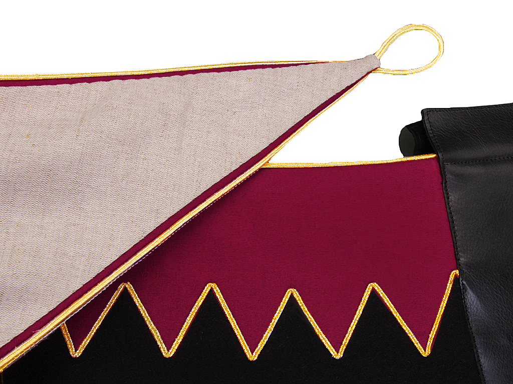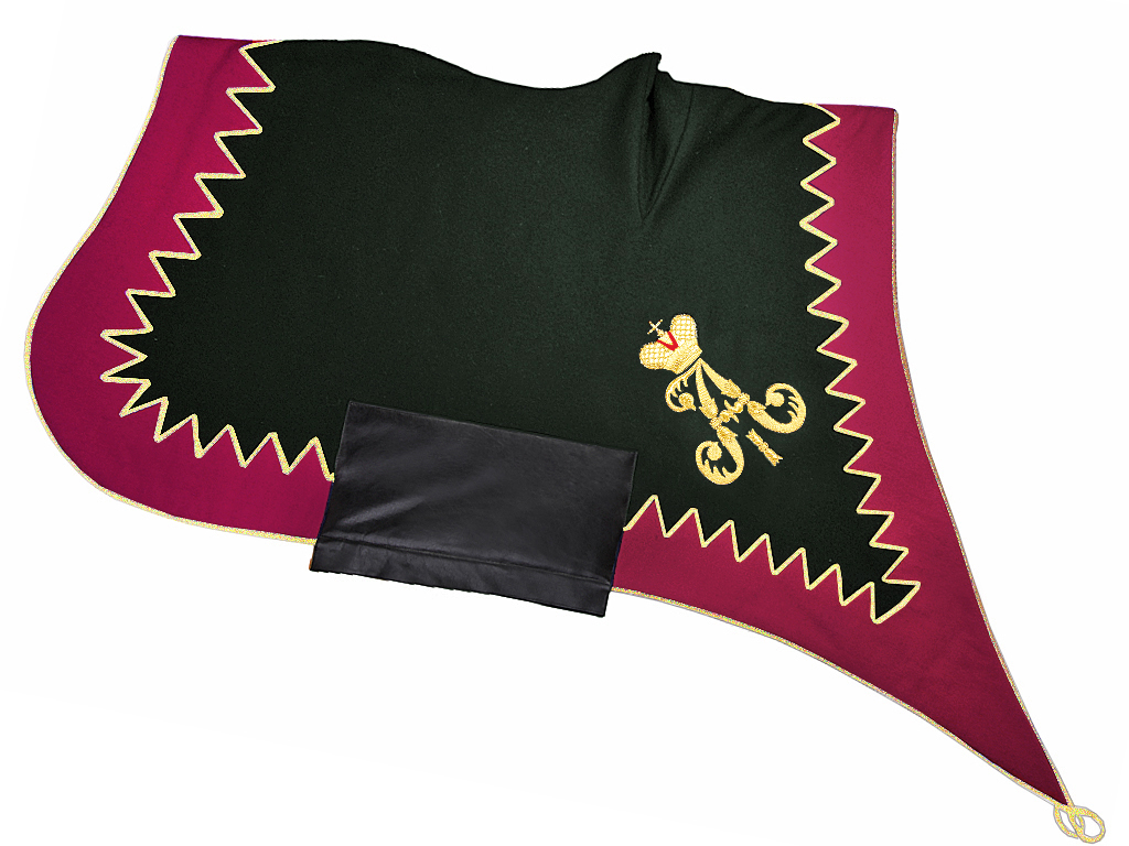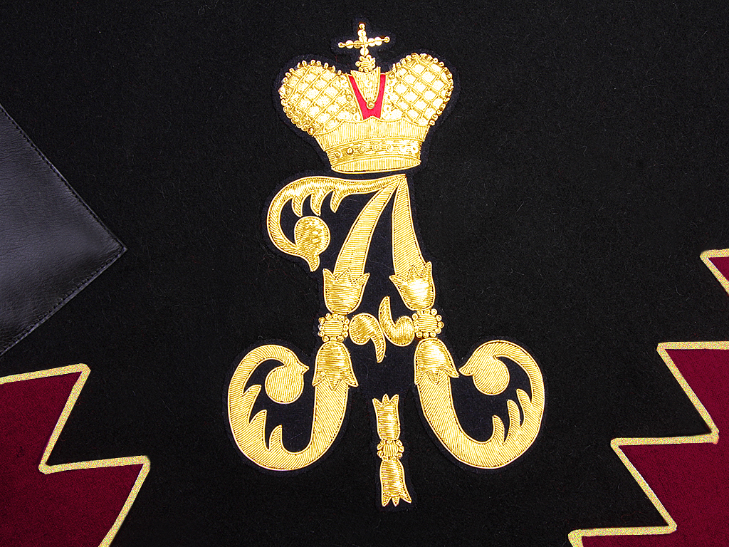 Шитый золотой металлизированной канителью вензель Императора Александра, который нашит в задней (тыльной) части вальтрапа при изготовлении реплики выполнен различными видами канители и шелка.