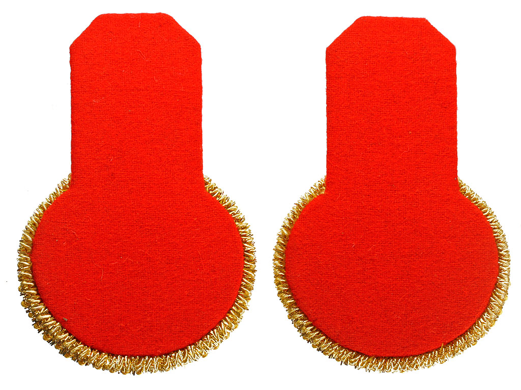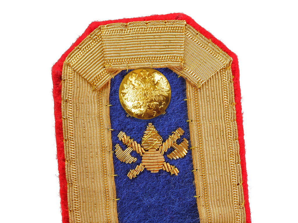 Эполеты носят только офицеры и только на мундирах. Поле эполет изготавливается из сукна василькового цвета с красным суконным подбоем и таким же кантом. Хотя первоначально для поля предписывалось использовать металлизированный галун золотистого цвета, по технологическим соображениям от этого отказались. Красный суконный контрпогончик украшается металлизированным галуном золотистого цвета. Нижняя полукруглая часть завершается валиком из четырех рядов золоченой мишуры и канители, а эполеты старших офицеров дополнительно украшаются толстой бахромой из золоченой канители.