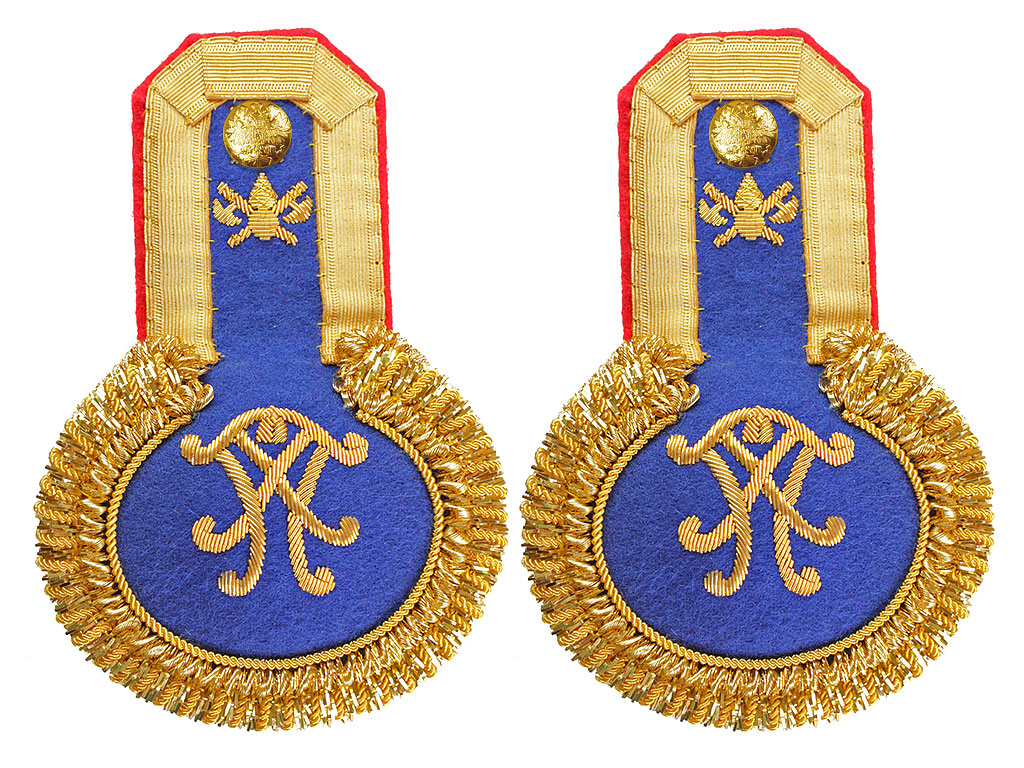 Эполеты младшего офицерского состава (лейтенант, старший лейтенант, капитан) Президентского (Кремлевского) полка для ношения при церемониальной форме одежды. Поле из сукна василькового цвета, с красным суконным подбоем. Нижняя часть завершается валиком из четырех рядов золоченой мишуры и канители. На поле эполета - шитый золотом вензель "ПП" ("Президентский полк"), в верхней (узкой) части - эмблема в виде пылающей гренады, наложенной на посольские топорики.