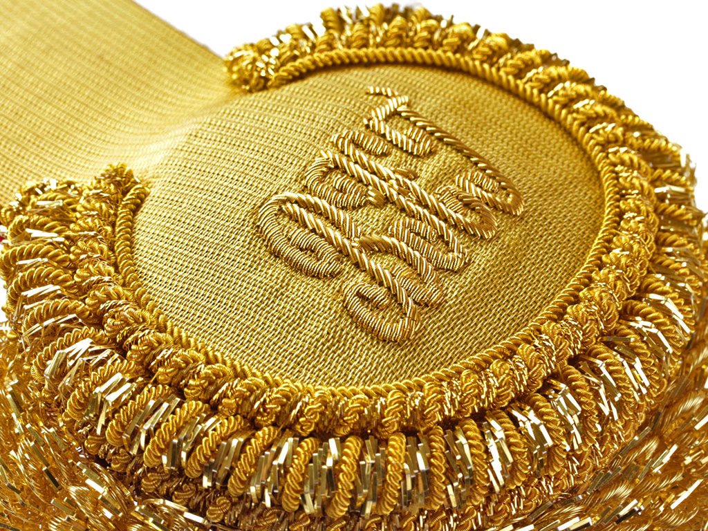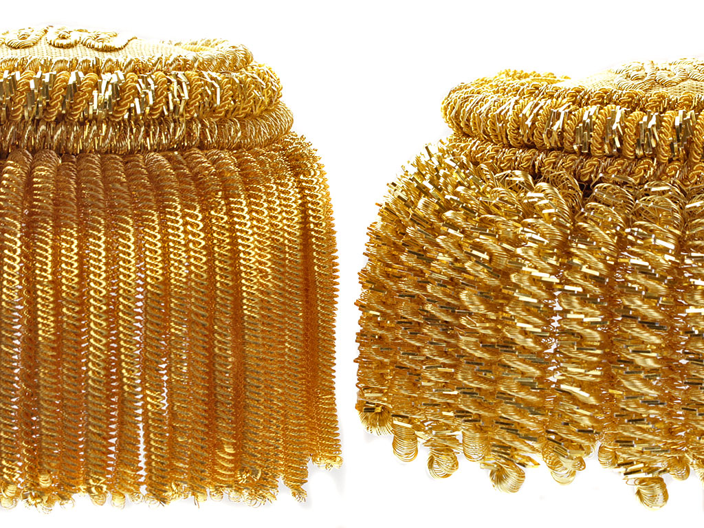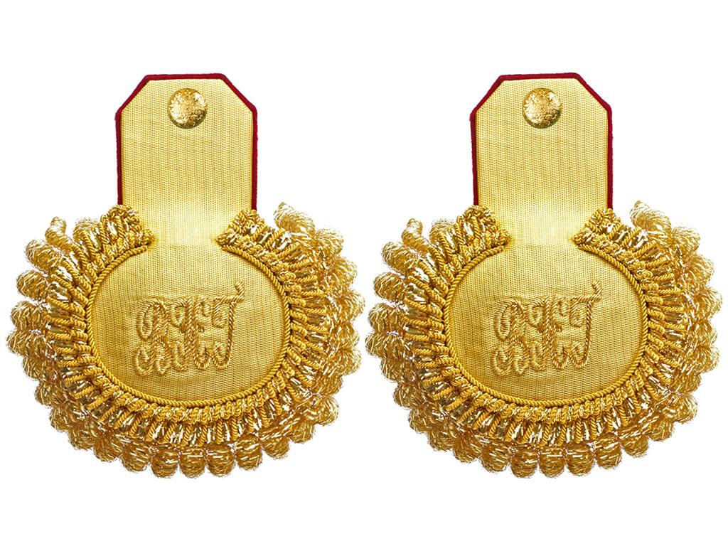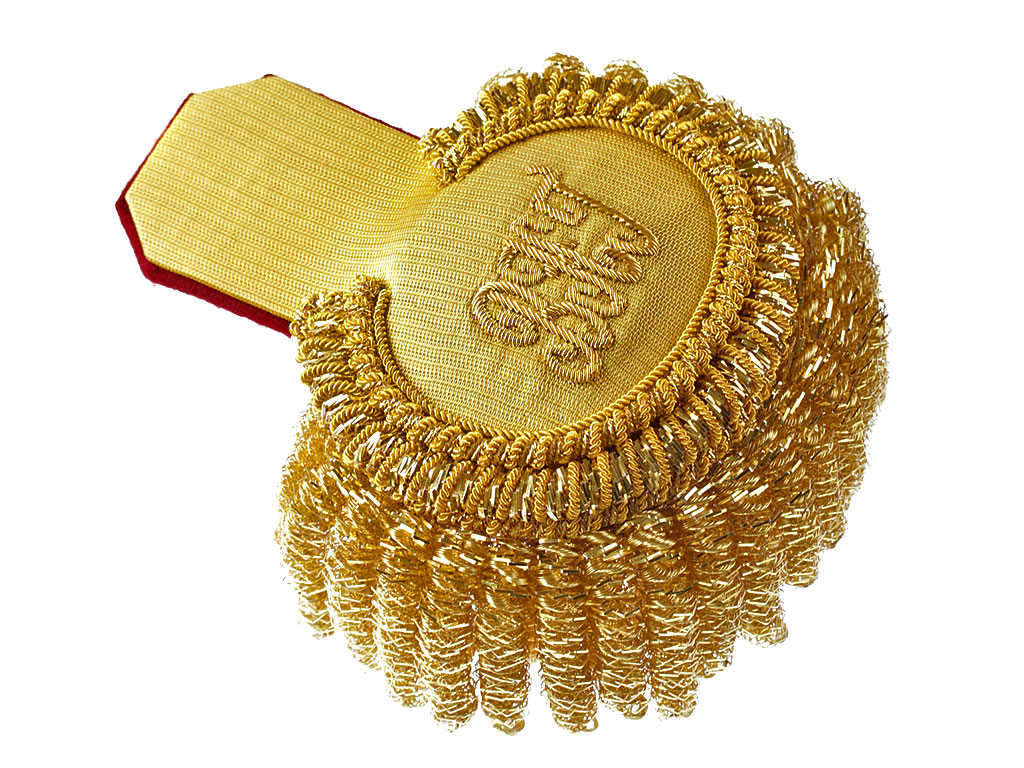 Эполеты высшего офицерского состава (генерал-майор, генерал-лейтенант, генерал-полковник) Войск национальной гвардии (Росгвардии) для ношения при концертной форме одежды. Поле золотое, с краповым суконным подбоем. Нижняя часть завершается валиком из четырех рядов золоченой мишуры и канители, обрамленным бахромой из толстой золоченой канители. На поле эполета - шитый золотом вензель "ВНГ" ("Войска национальной гвардии").