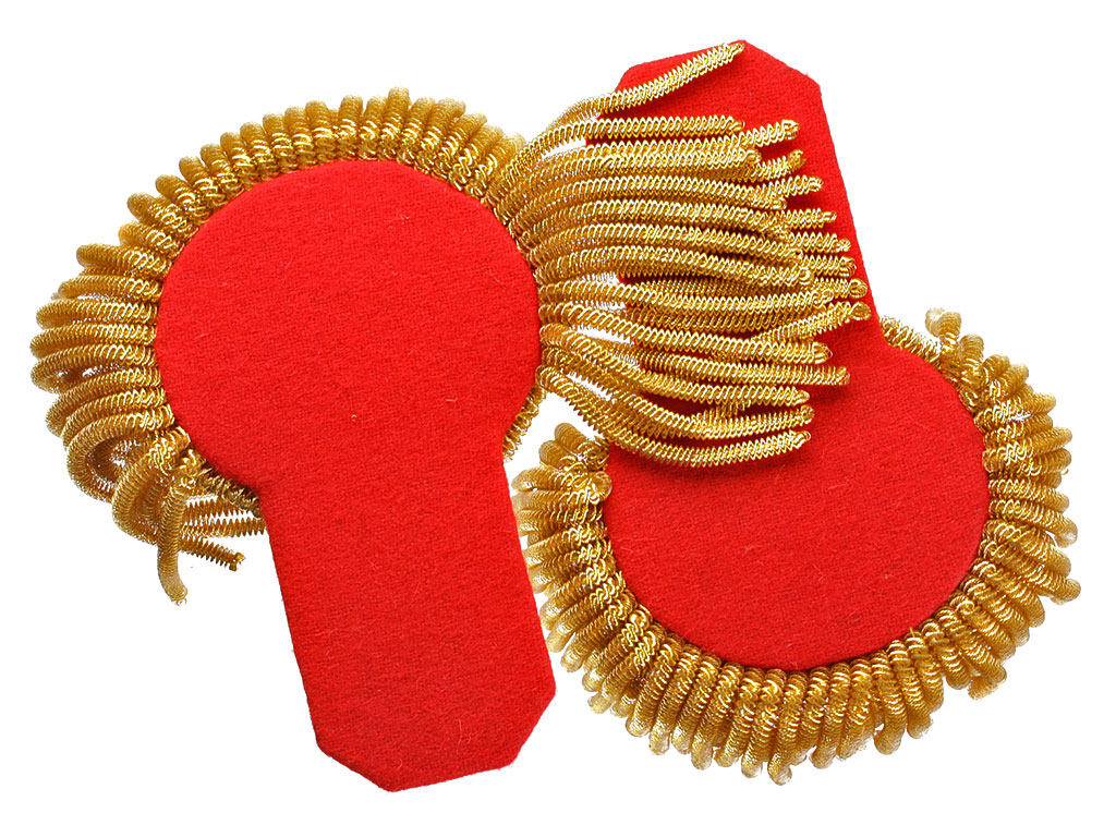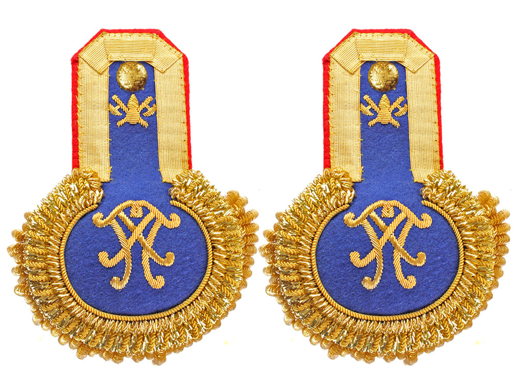 Эполеты носят только офицеры и только на мундирах. Поле эполет изготавливается из сукна василькового цвета с красным суконным подбоем и таким же кантом. Хотя первоначально для поля предписывалось использовать металлизированный галун золотистого цвета, по технологическим соображениям от этого отказались. Красный суконный контрпогончик украшается металлизированным галуном золотистого цвета. Нижняя полукруглая часть завершается валиком из четырех рядов золоченой мишуры и канители, а эполеты старших офицеров дополнительно украшаются толстой бахромой из золоченой канители.