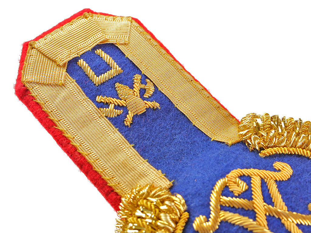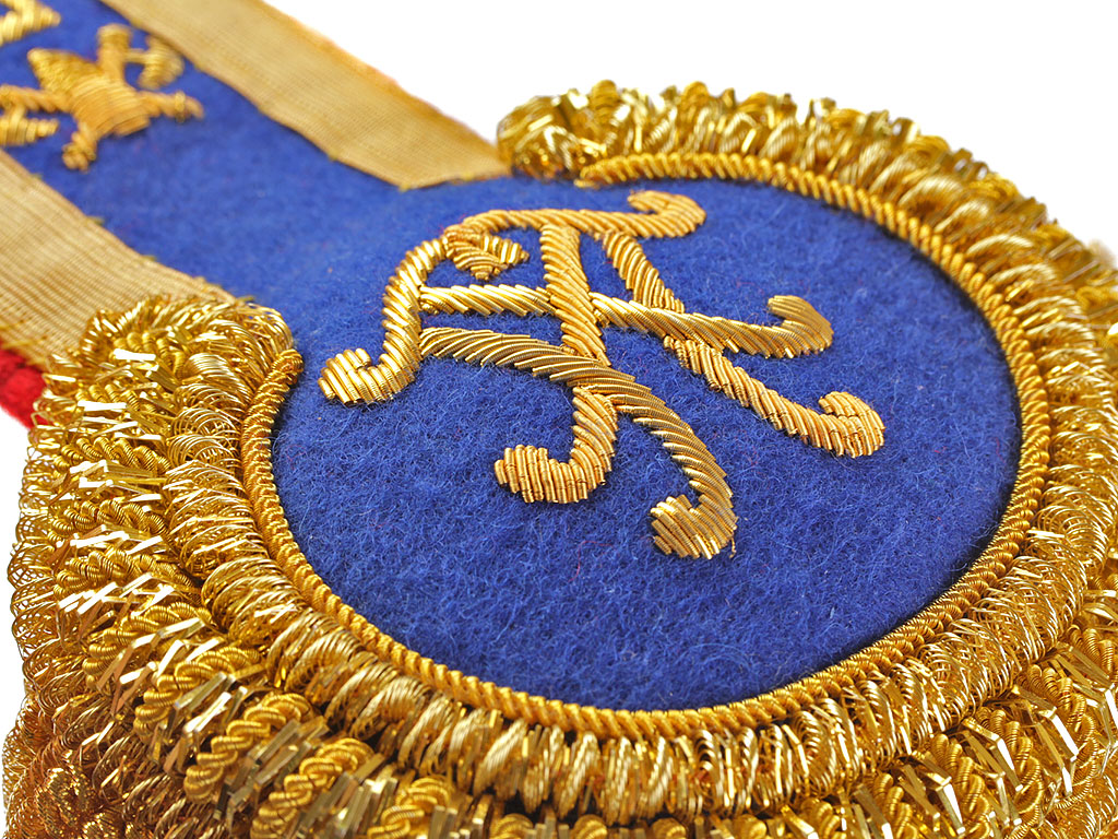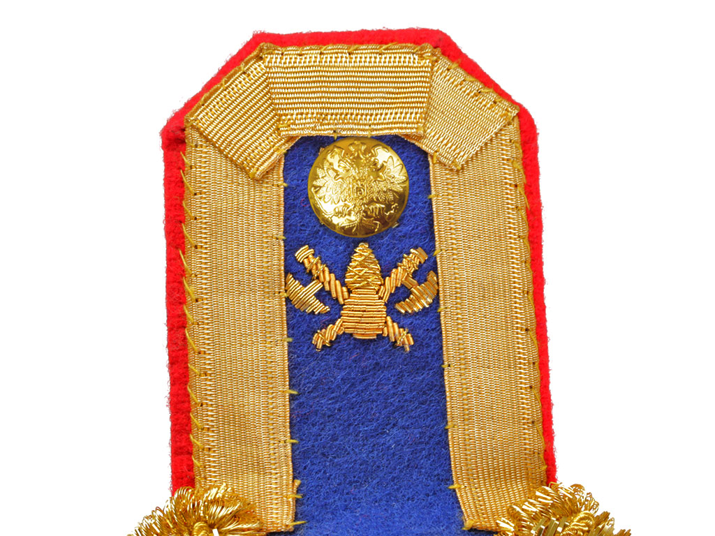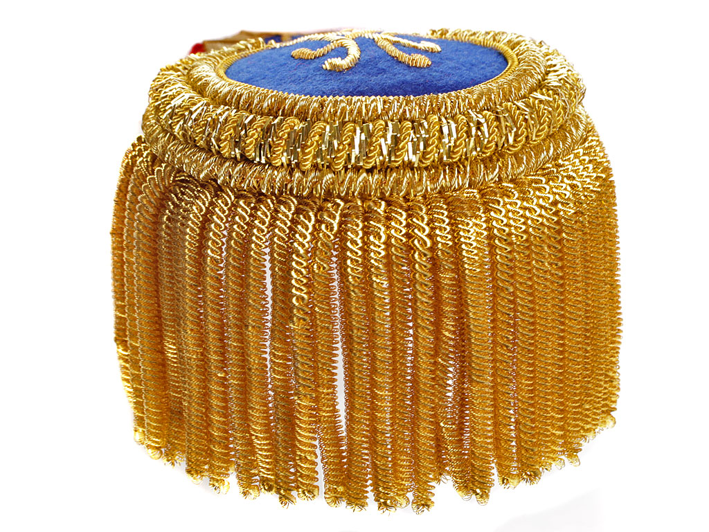 Эполеты старшего офицерского состава (майор, подполковник, полковник) Президентского (Кремлевского) полка для ношения при церемониальной форме одежды. Поле из сукна василькового цвета, с красным суконным подбоем. Нижняя часть завершается валиком из четырех рядов золоченой мишуры и канители, обрамленным бахромой из золоченой канители. На поле эполета - шитый золотом вензель "ПП" ("Президентский полк"), в верхней (узкой) части - эмблема в виде пылающей гренады, наложенной на посольские топорики.