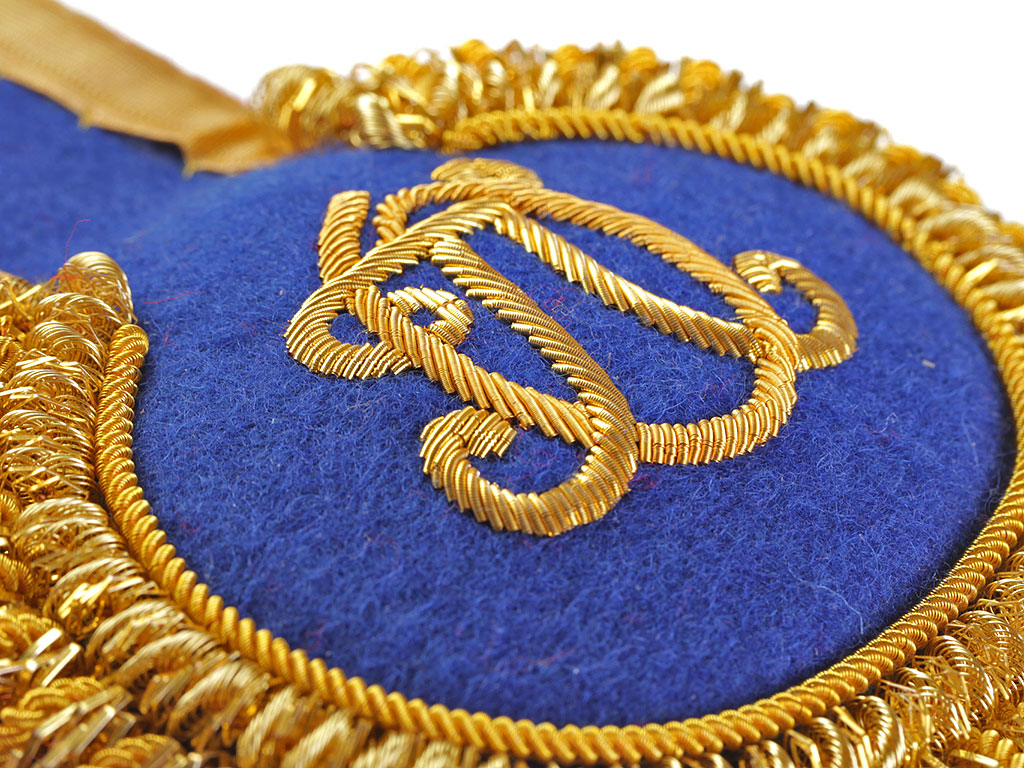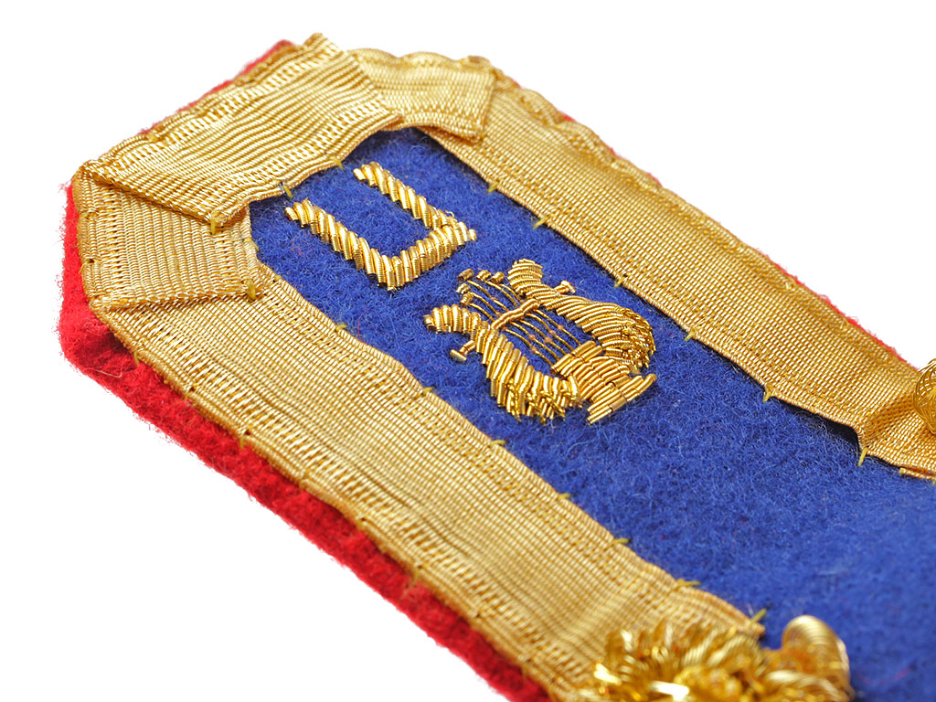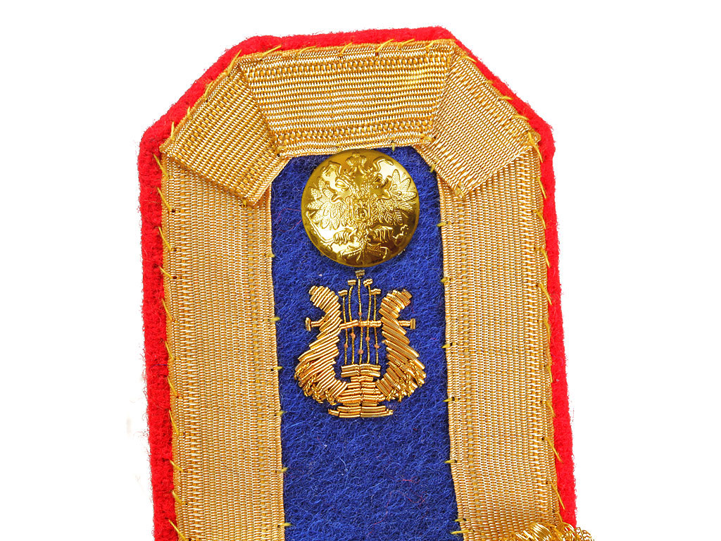 Эполеты младшего офицерского состава (лейтенант, старший лейтенант, капитан) Президентского оркестра для ношения при церемониальной форме одежды. Поле из сукна василькового цвета, с красным суконным подбоем. Нижняя часть завершается валиком из четырех рядов золоченой мишуры и канители. На поле эполета - шитый золотом вензель "ПО" ("Президентский оркестр"), в верхней (узкой) части - эмблема военно-оркестровой службы в виде лиры.