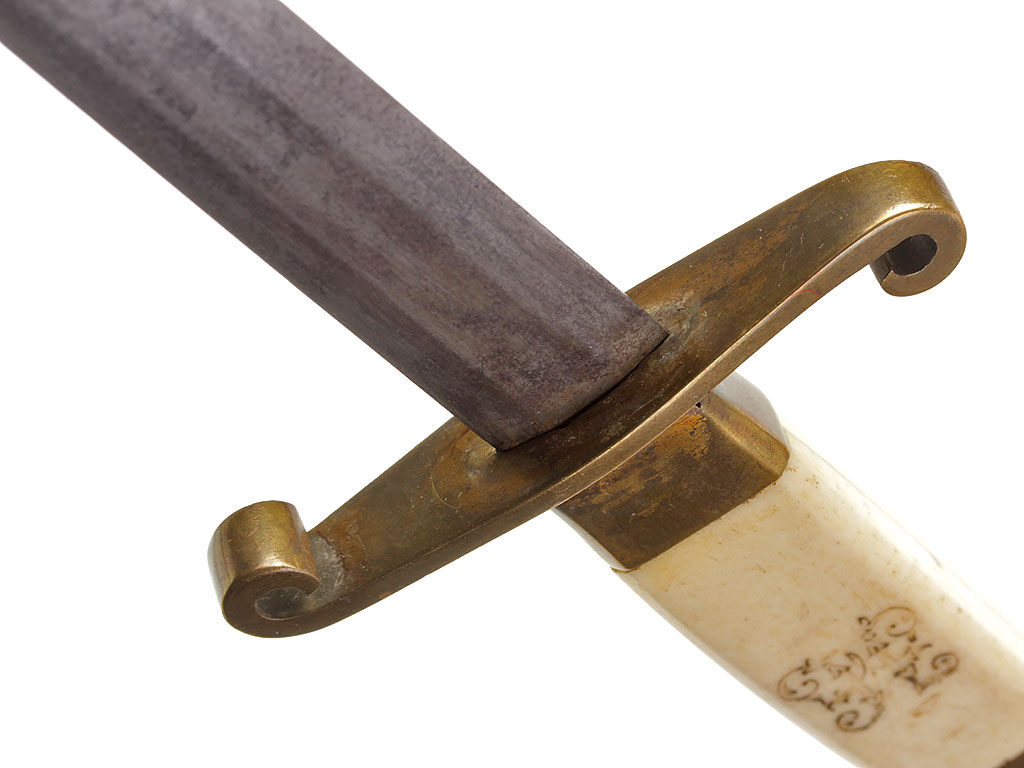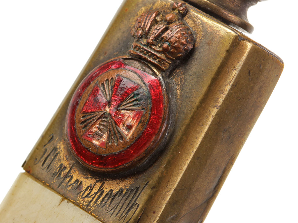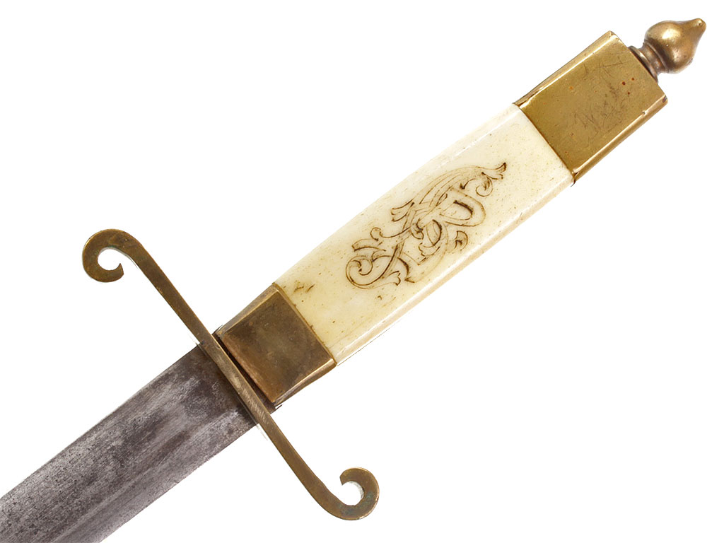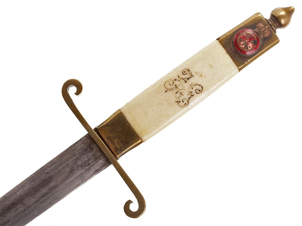 Рукоять из слоновой кости, образована двумя плотно подогнанными щечками. С лицевой стороны рукояти - гравированный по кости вензель императора Николая II (корона над ним затерта после Февральской революции). На внутренней стороне рукояти выгравирована монограмма владельца "АВ". Прибор рукояти латунный, в недоступных для чистки местах сохранились следы золочения. На верхней втулке помещен миниатюрный знак ордена Св.Анны IV степени, а под ним (крайне необычное размещение надписи) - гравированная надпись "За храбрость". Гарда S-образная, достаточно тонкая.