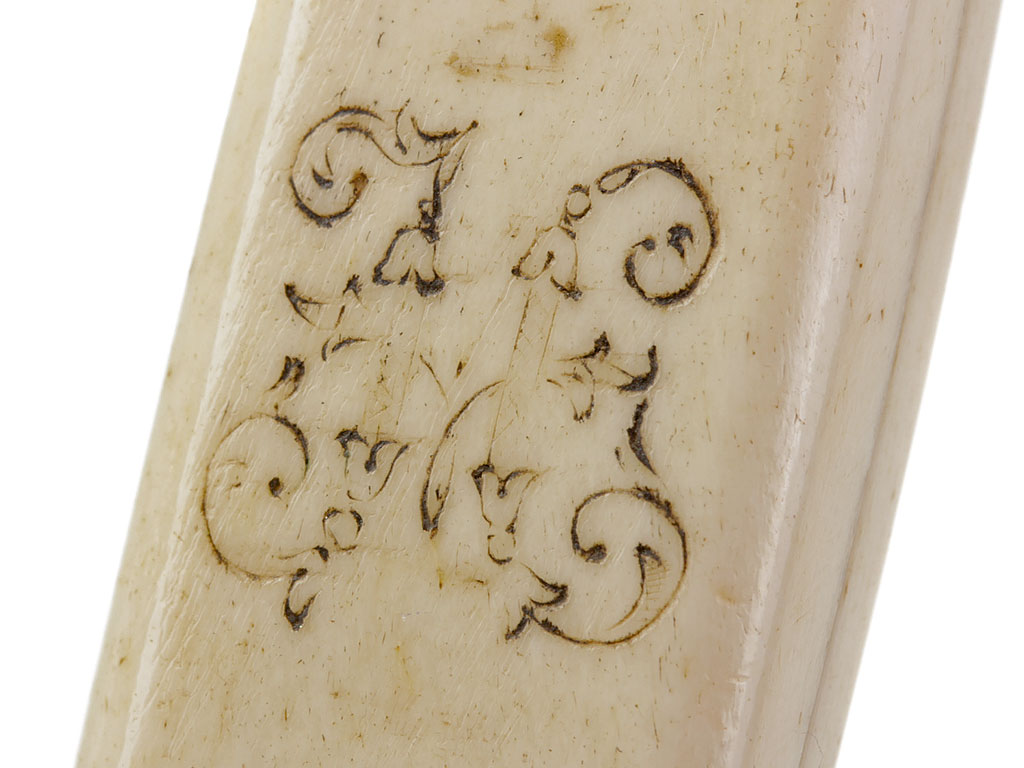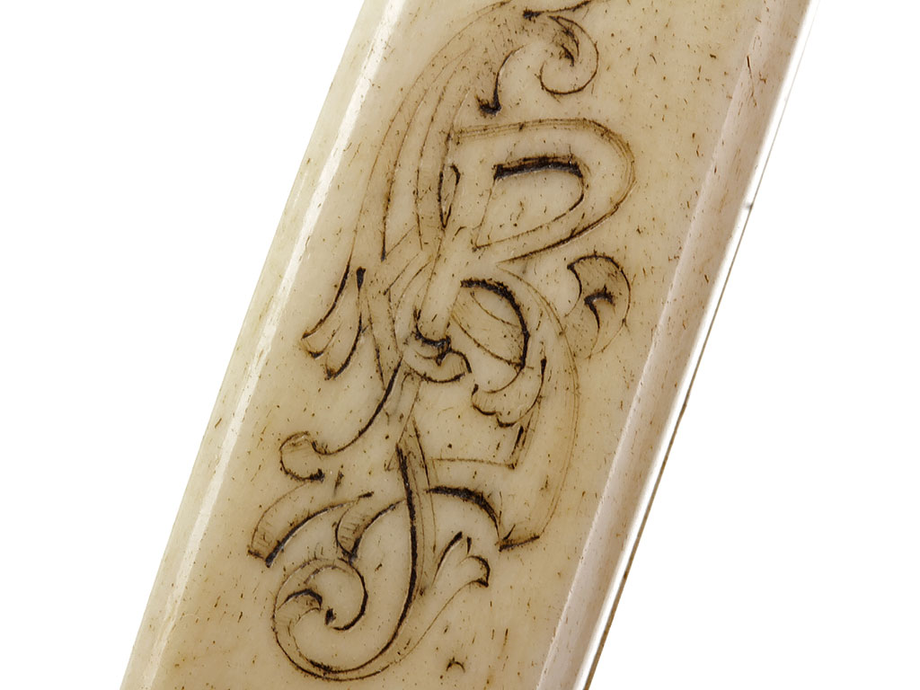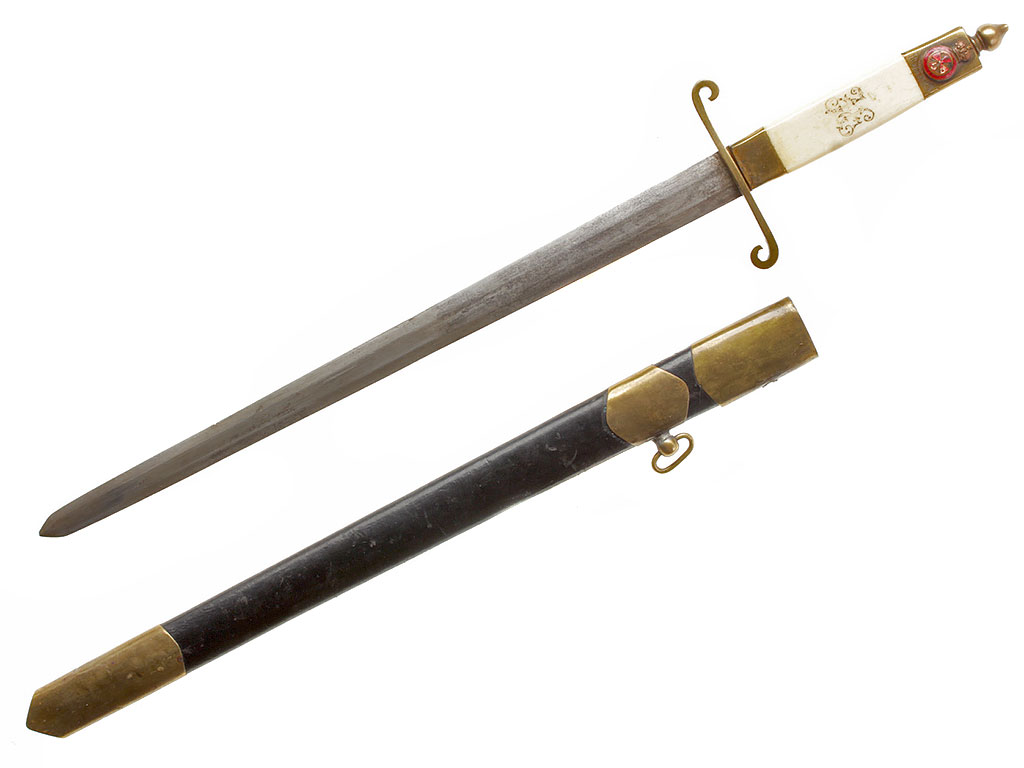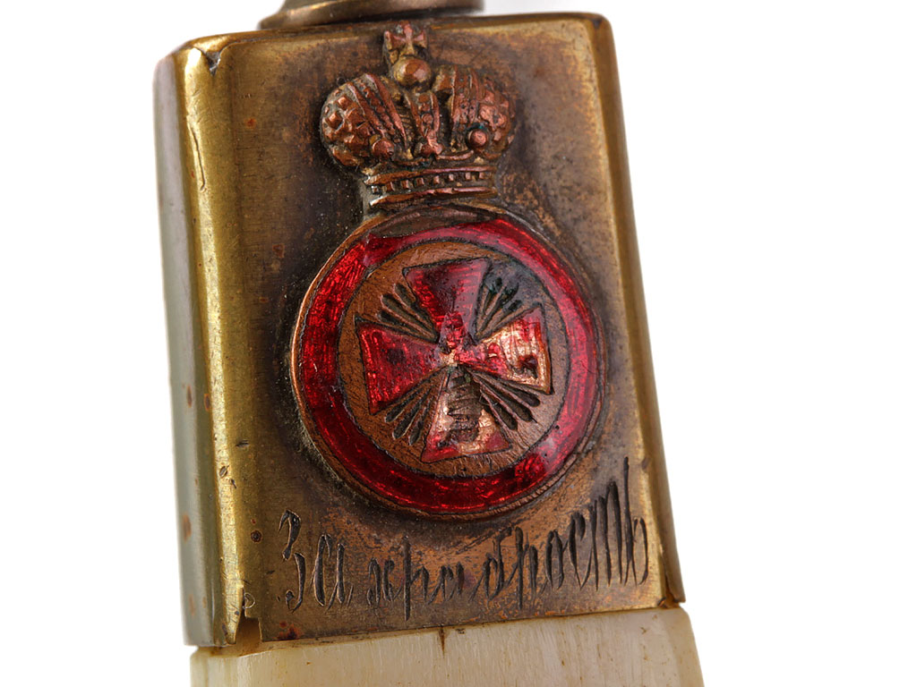 Рукоять из слоновой кости, образована двумя плотно подогнанными щечками. С лицевой стороны рукояти - гравированный по кости вензель императора Николая II (корона над ним затерта после Февральской революции). На внутренней стороне рукояти выгравирована монограмма владельца "АВ". Прибор рукояти латунный, в недоступных для чистки местах сохранились следы золочения. На верхней втулке помещен миниатюрный знак ордена Св.Анны IV степени, а под ним (крайне необычное размещение надписи) - гравированная надпись "За храбрость". Гарда S-образная, достаточно тонкая.