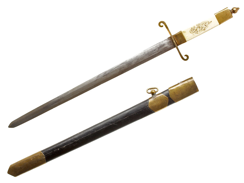 Ножны деревянные, обтянутые черной лаковой кожей, с латунным устьем, гайкой и наконечником; кольцо для крепления к портупее на устье ножен обломано.