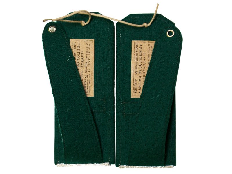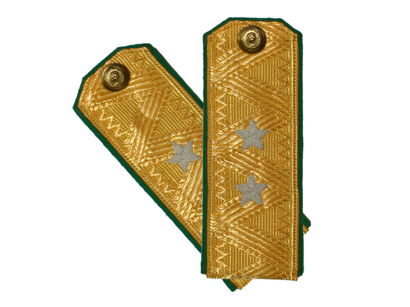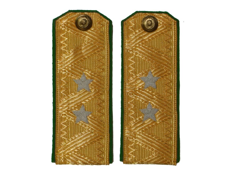 Пара повседневных погон генерал-лейтенанта пограничных войск (строевой состав). Золотое металлизированное поле с двумя шитыми серебряными звездами, зеленый кант и подложка. Пуговицы погонные латунные, с изображением Государственного герба СССР.