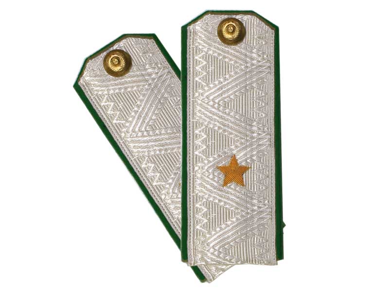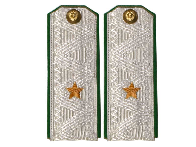 Пара повседневных погон генерал-майора пограничных войск (нестроевой состав). Серебряное металлизированное поле с одной шитой золотой звездой, зеленый кант и подложка. Пуговицы погонные латунные, с изображением Государственного герба СССР.