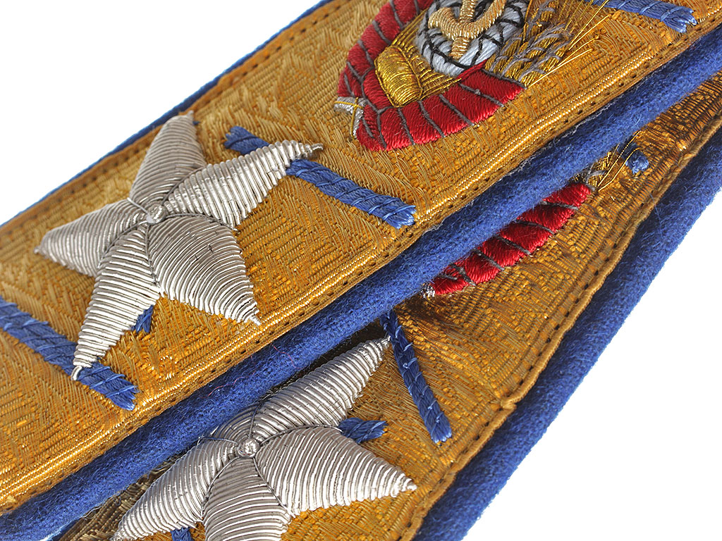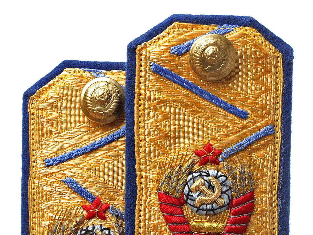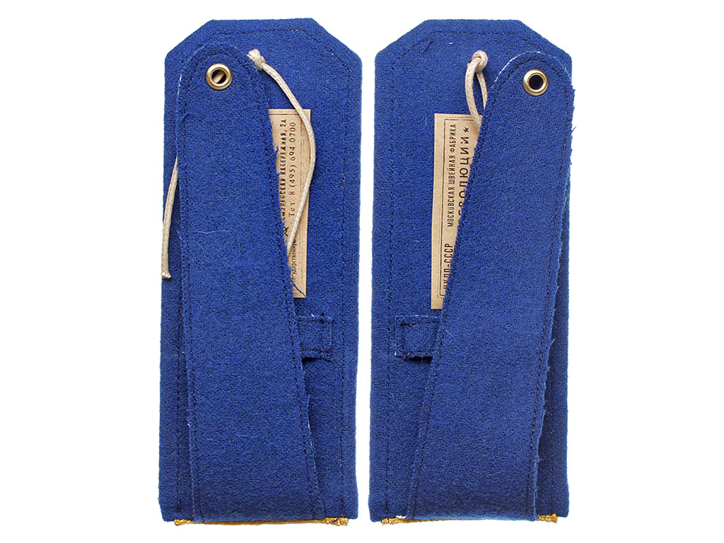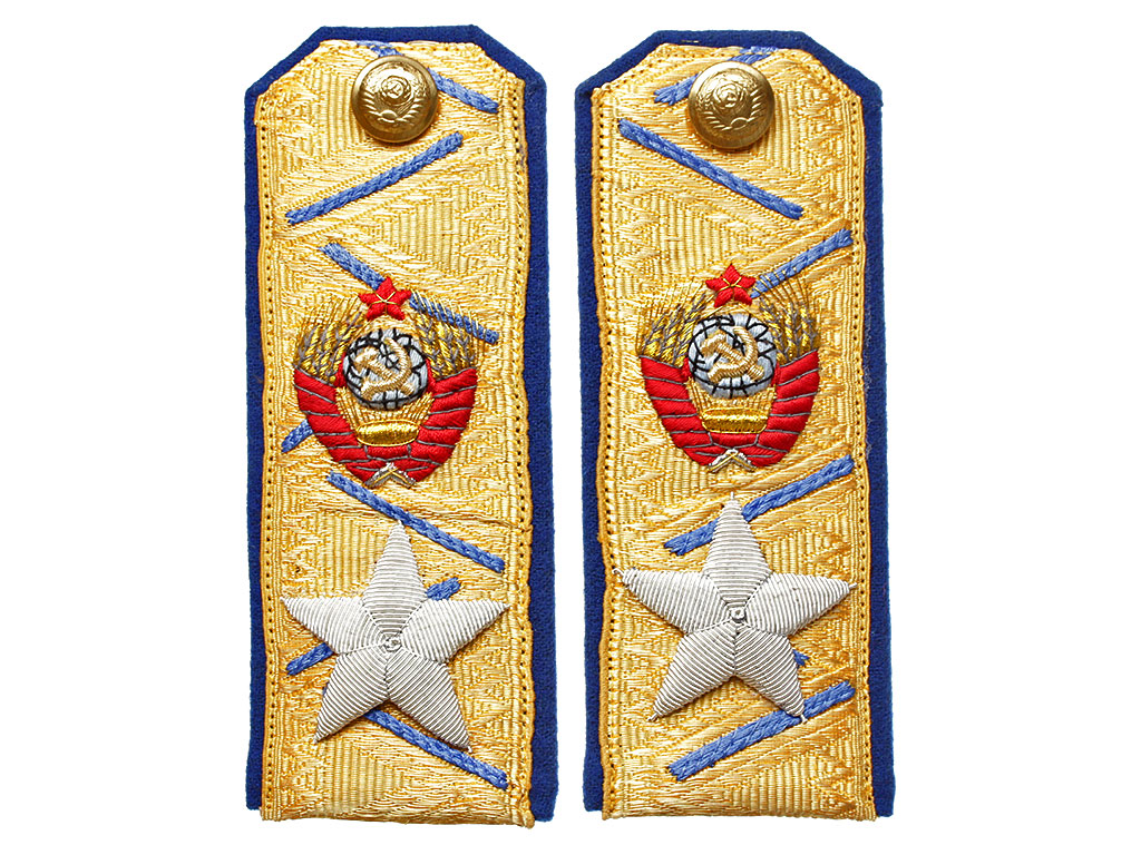Золотое металлизированное поле с васильковым кантом и зигзагообразным просветом, с большой шитой серебряной звездой и гербом СССР. Пуговицы погонные латунные, с изображением Государственного герба СССР.