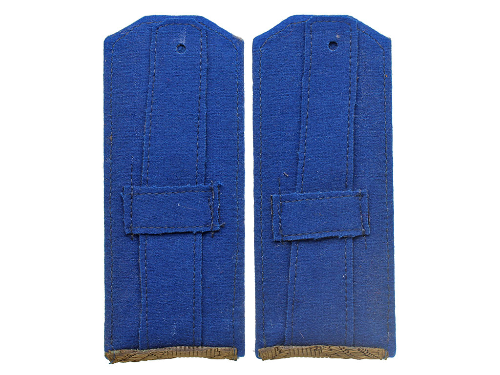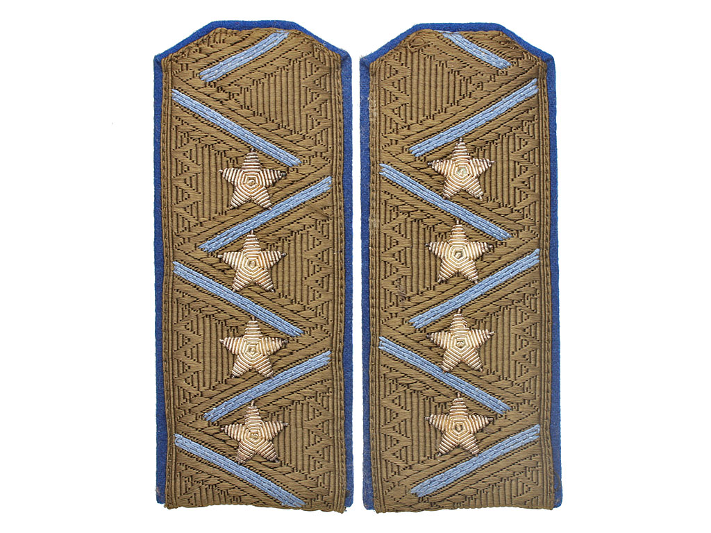 Пара полевых погон комиссара Государственной Безопасности (ГБ) 1-го ранга. Защитного цвета поле с голубым кантом и зигзагообразным просветом, с четырьмя шитыми серебряными звездами.