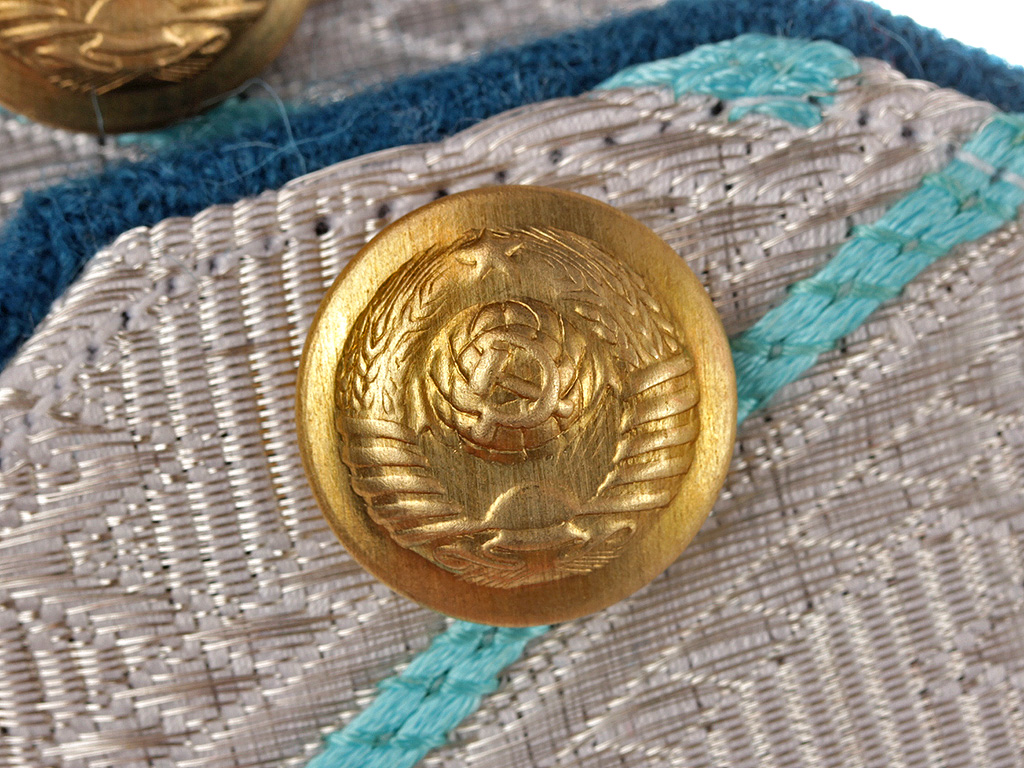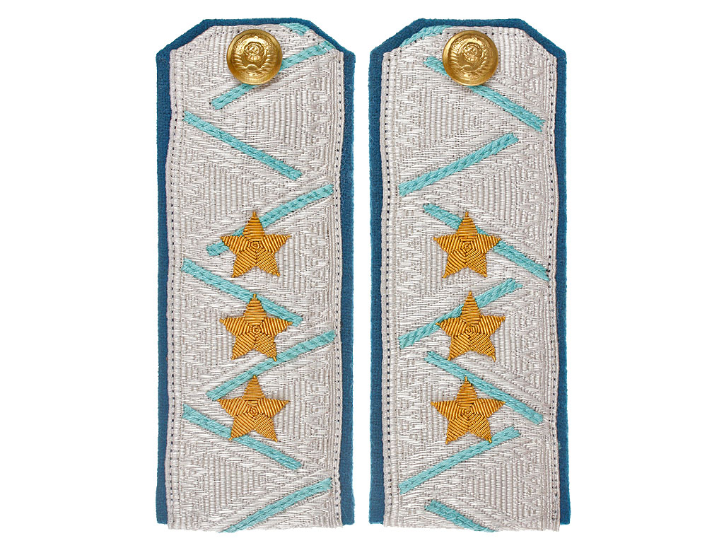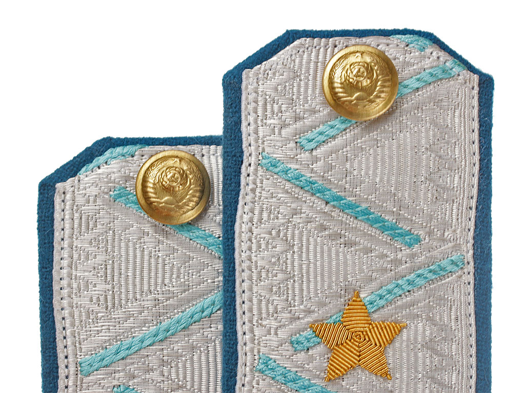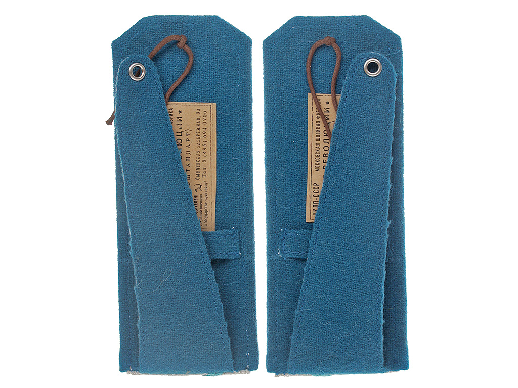 Пара повседневных погон комиссара милиции (РКМ) 2-го ранга. Серебряное металлизированное поле с голубым кантом и зигзагообразным просветом, с тремя шитыми золотыми звездами. Пуговицы погонные латунные, с изображением Государственного герба СССР.