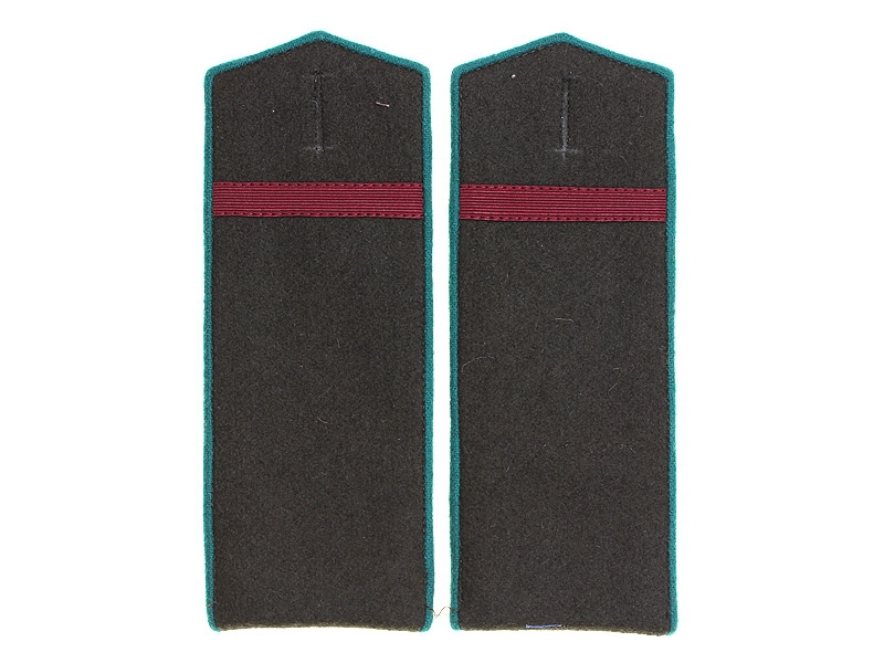 Повседневные погоны рядового состава и младшего комначсостава пятиугольные из сукна цвета по родам войск, с цветной окантовкой, с эмблемами родов войск и служб (латунные желтого металла).