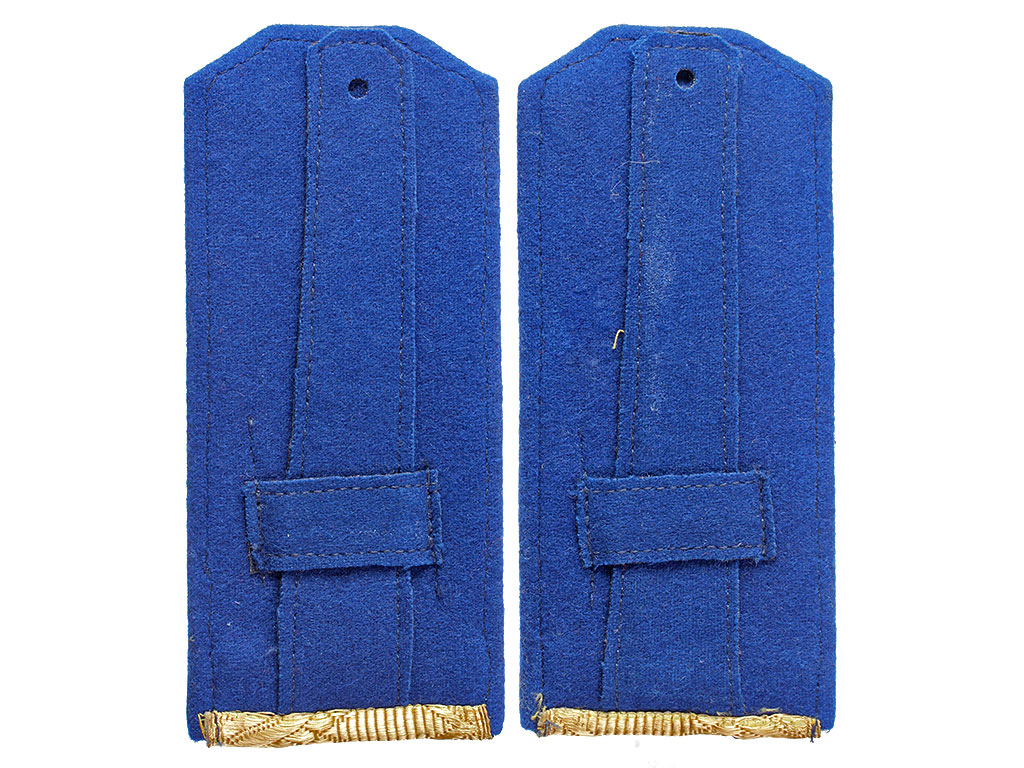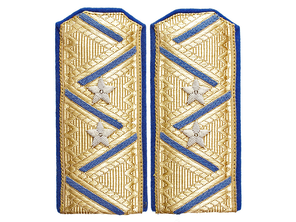 Пара повседневных погон комиссара Государственной Безопасности (ГБ) 3-го ранга. Золотое металлизированное поле с голубым кантом и зигзагообразным просветом, с двумя шитыми серебряными звездами.