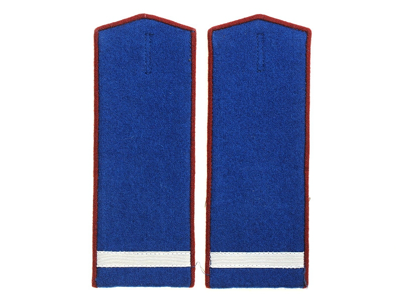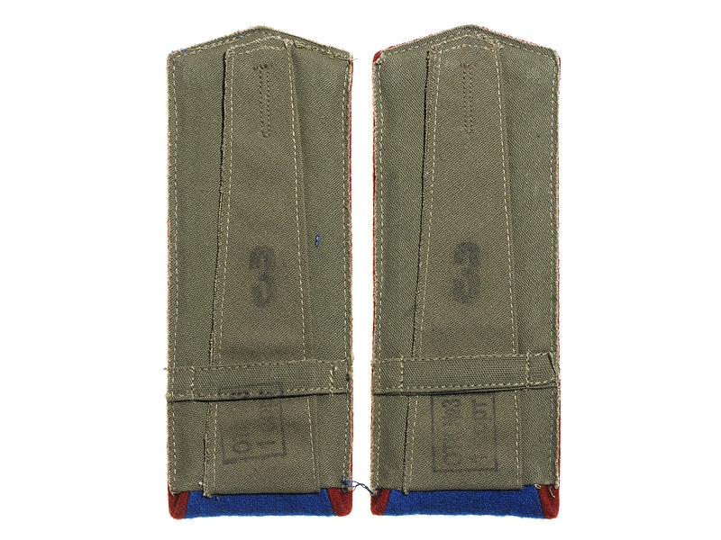 Повседневные погоны рядового состава и младшего комначсостава пятиугольные из сукна цвета по родам войск, с цветной окантовкой, с эмблемами родов войск и служб (латунные желтого металла).