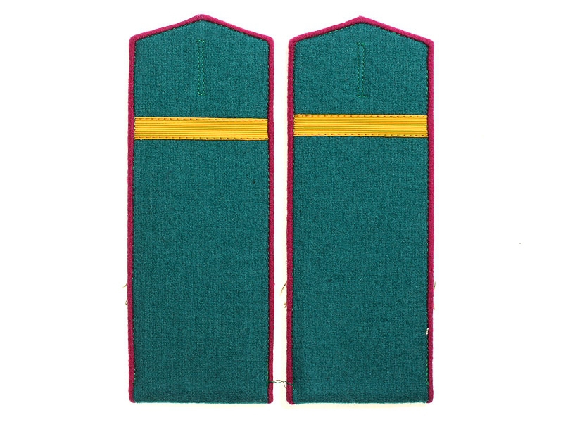 Повседневные погоны рядового состава и младшего комначсостава пятиугольные из сукна цвета по родам войск, с цветной окантовкой, с эмблемами родов войск и служб (латунные желтого металла).