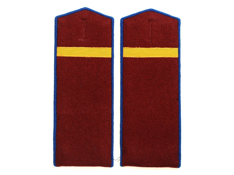 Повседневные погоны рядового состава и младшего комначсостава пятиугольные из сукна цвета по родам войск, с цветной окантовкой, с эмблемами родов войск и служб (латунные желтого металла).
