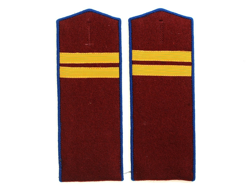 Повседневные погоны рядового состава и младшего комначсостава пятиугольные из сукна цвета по родам войск, с цветной окантовкой, с эмблемами родов войск и служб (латунные желтого металла).