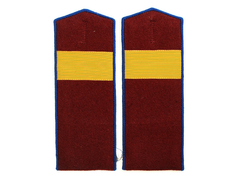 Повседневные погоны рядового состава и младшего комначсостава пятиугольные из сукна цвета по родам войск, с цветной окантовкой, с эмблемами родов войск и служб (латунные желтого металла).