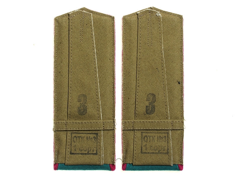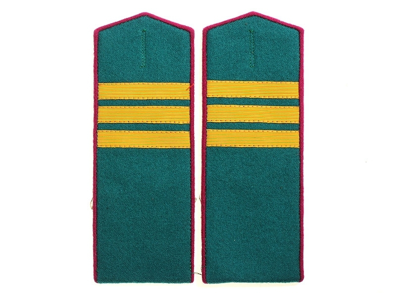 Повседневные погоны рядового состава и младшего комначсостава пятиугольные из сукна цвета по родам войск, с цветной окантовкой, с эмблемами родов войск и служб (латунные желтого металла).