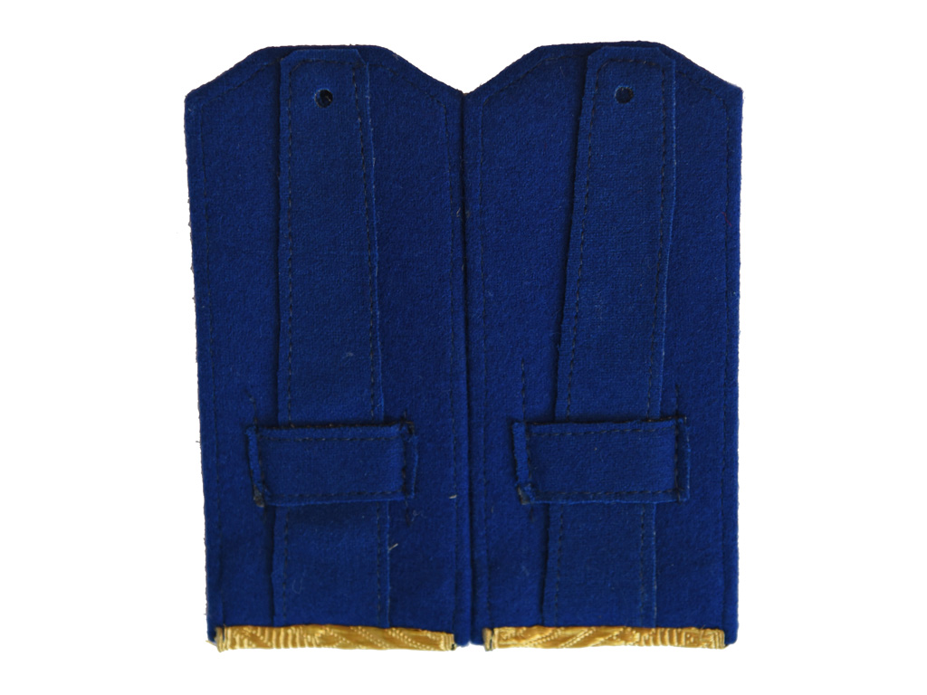 Пара повседневных погон комиссара Государственной Безопасности (ГБ) 2-го ранга. Золотое металлизированное поле с голубым кантом и зигзагообразным просветом, с тремя шитыми серебряными звездами.