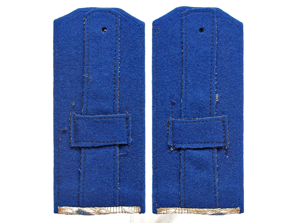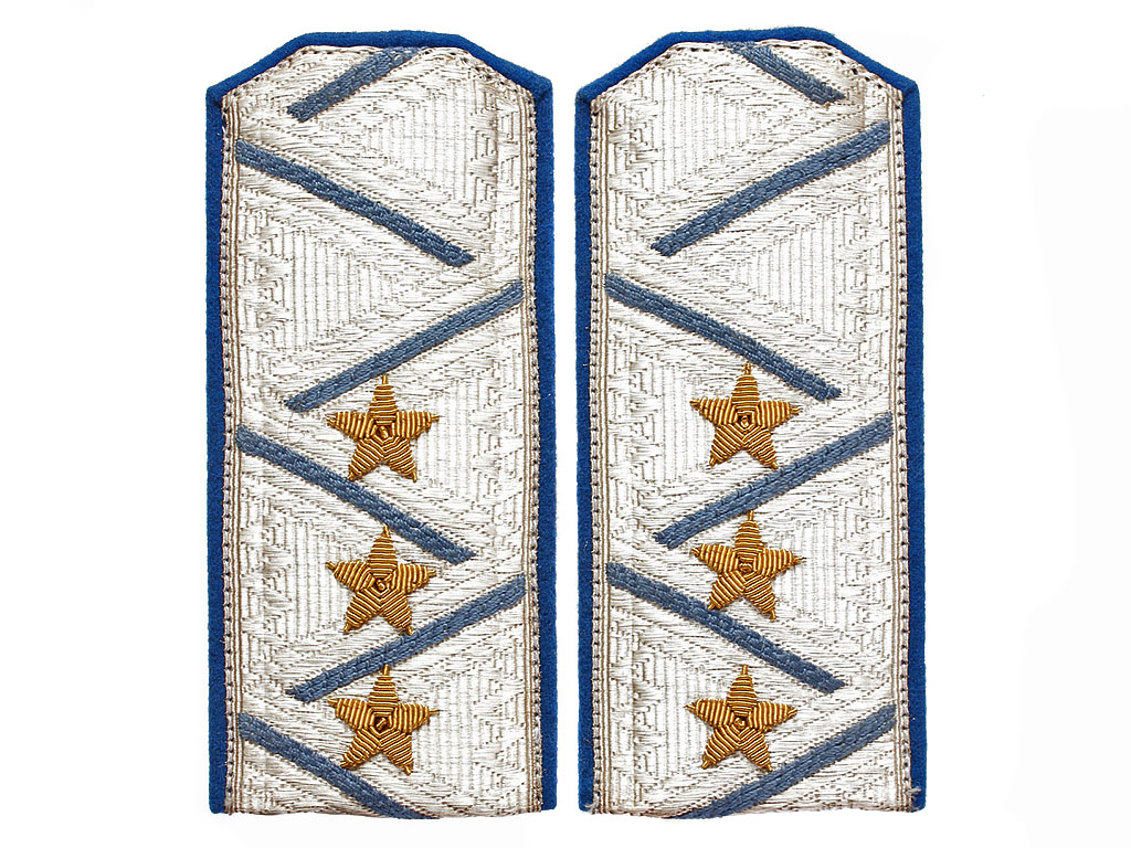 Пара повседневных погон комиссара милиции (РКМ) 2-го ранга. Серебряное металлизированное поле с голубым кантом и зигзагообразным просветом, с тремя шитыми золотыми звездами.