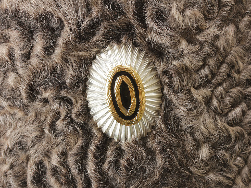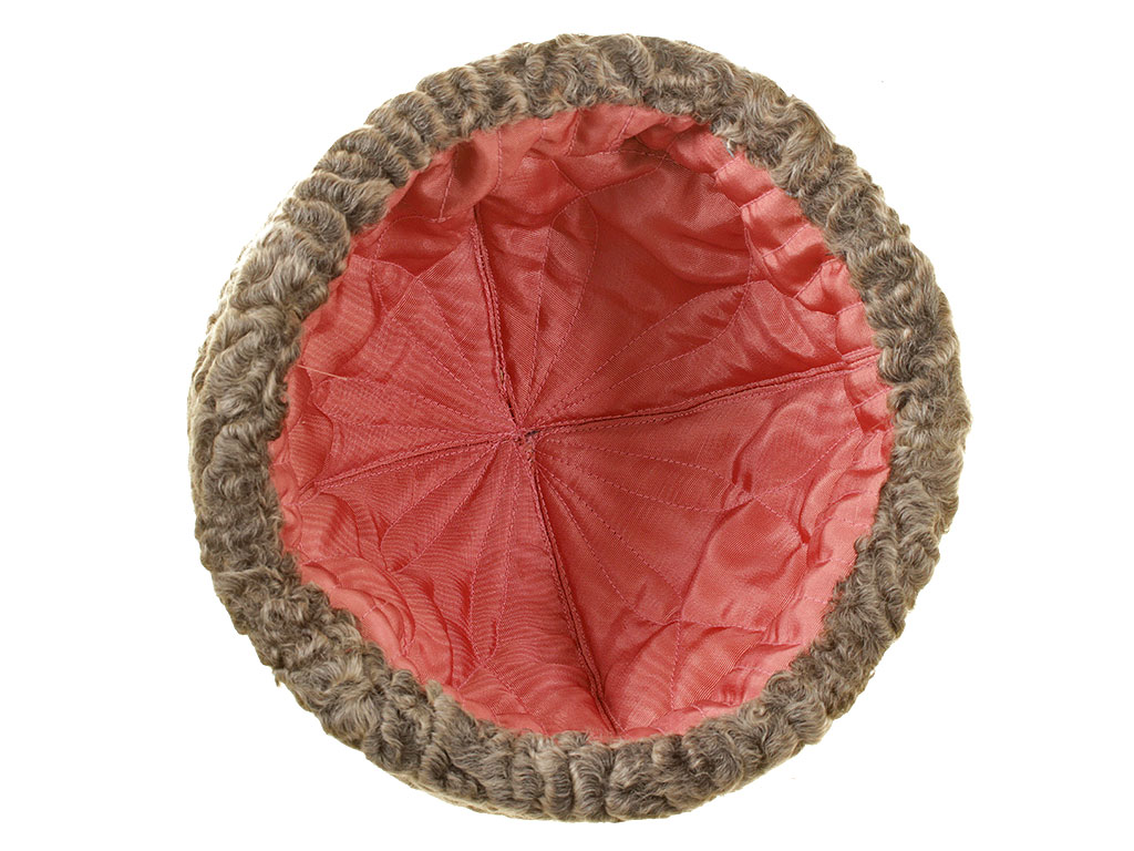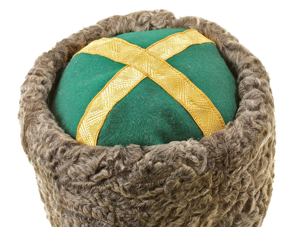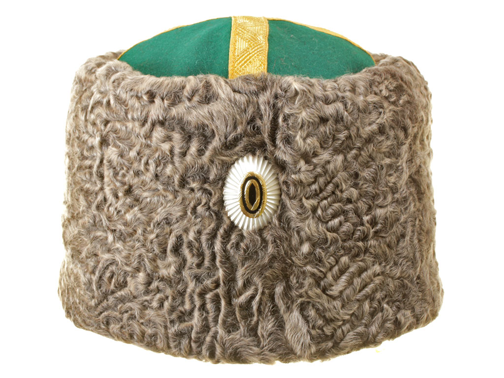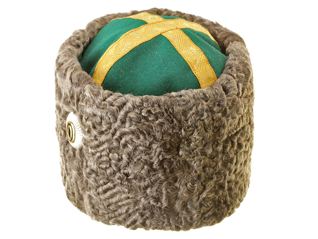Натуральный каракулевый мех, сукно, муаровая подкладка, золотой металлизированный галун. В комплекте офицерская кокарда.