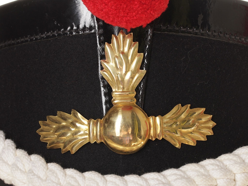 Кивер образца 1808 года с репейком 1-го батальона гренадерской роты (образца 1811 года), этишкет, гренада "о трех огнях", султан черного цвета.