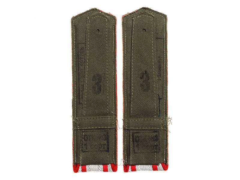 Повседневные погоны рядового состава и младшего комначсостава пятиугольные из сукна цвета по родам войск, с цветной окантовкой, с эмблемами родов войск и служб (латунные желтого металла).