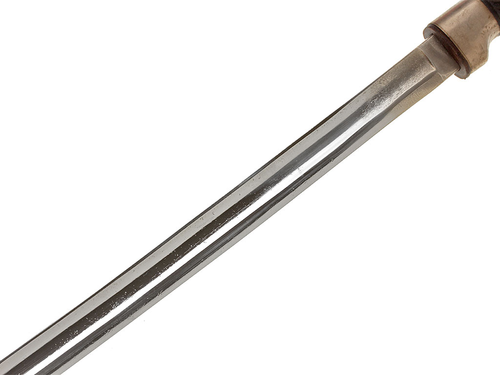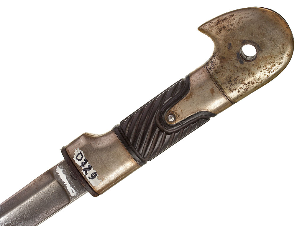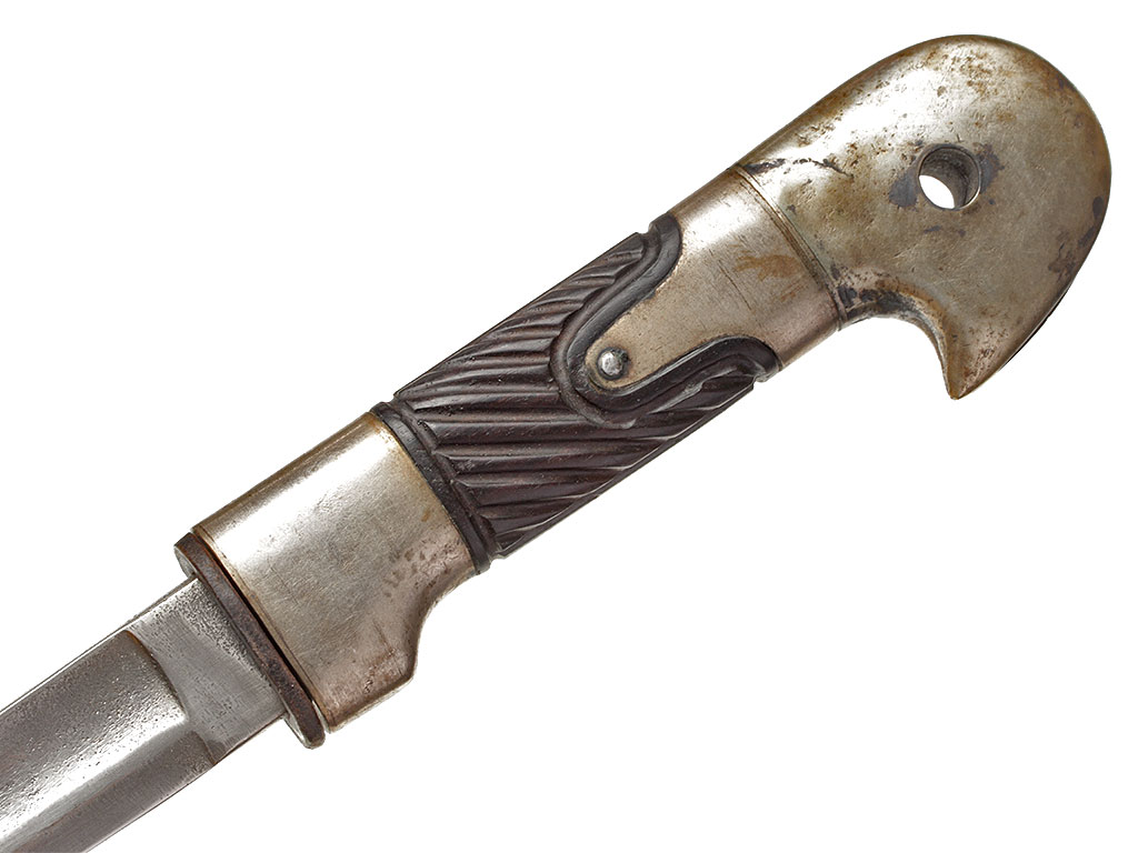 Клинок незначительной кривизны, с одним долом на каждой стороне, боевой конец двулезвийный. У основания - клеймо фирмы-изготовителя в виде черепа (Friedrich Neeff ?).