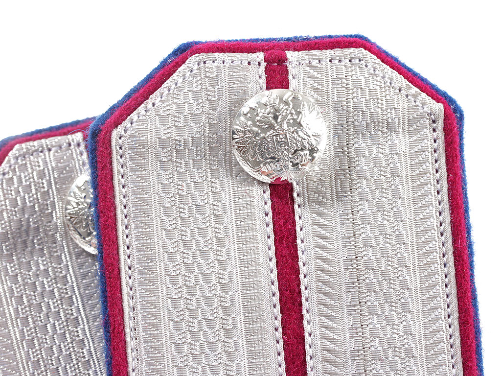 Погоны ротмистра 15-го уланского Татарского полка РИА. Белое металлизированное поле, малиновый просвет, синяя основа, двойной кант (синий и малиновый). Россия, копия
