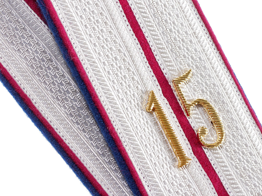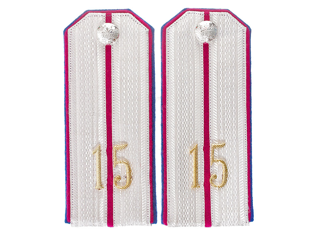 |Погоны ротмистра 15-го уланского Татарского полка РИА. Белое металлизированное поле, малиновый просвет, синяя основа, двойной кант (синий и малиновый). Россия, копия