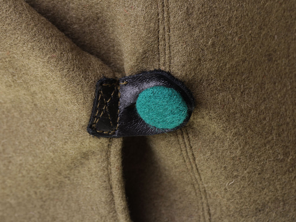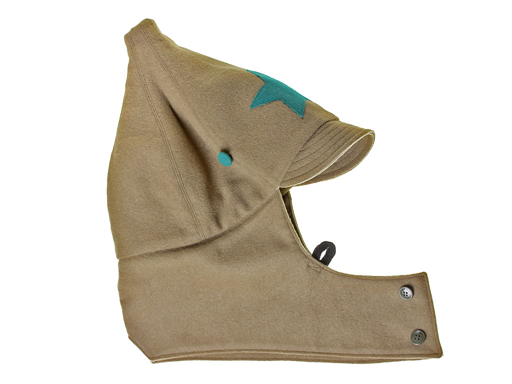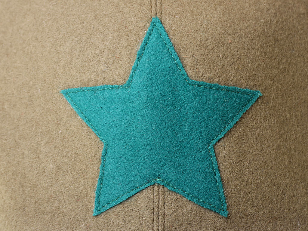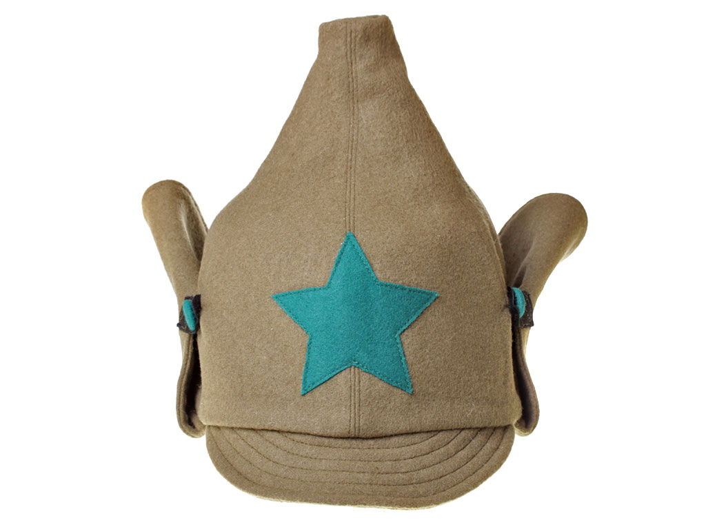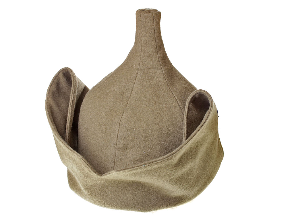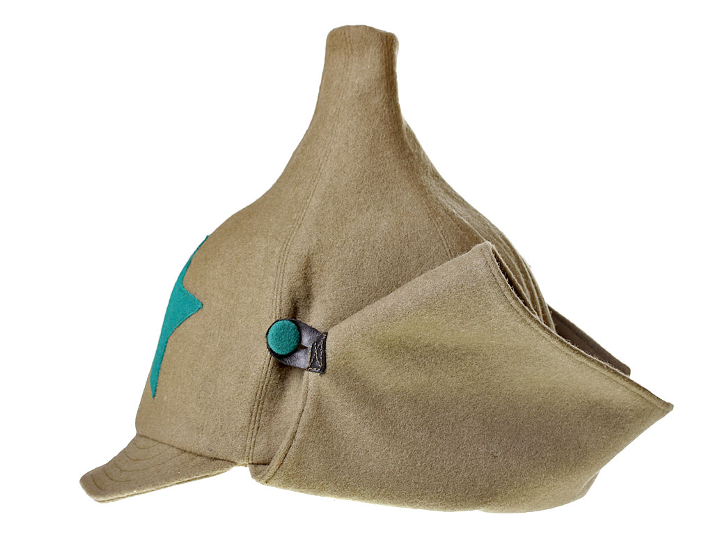 За образец при изготовлении представленного экземпляра была взята уставная зимняя (всесезонная) оригинальная командирская буденовка самого раннего типа, принятого в 1922 году. Шлем пошит из сукна защитного цвета и состоит из колпака, сужающегося кверху, и отгибающихся назатыльника и козырька. Колпак состоит из шести одинаковых кусков формы равнобедренного сферического треугольника, сшиваемых один с другим по боковым сторонам так, что вершины треугольников сходятся вверху в центре колпака. Спереди шлема нашита правильная пятиконечная звезда из приборного сукна присвоенного роду войск цвета: в представленном случае звезда из байковой ткани зеленого цвета. Металлическая звездочка на такие шлемы устанавливалась самого раннего типа, принятого в РККА (с изображением скрещенных плуга и молота) - стоит отметить, что чаще всего в то время буденовка носилась без металлической звезды. Подкладка под шлем - из хлопчатобумажной ткани.