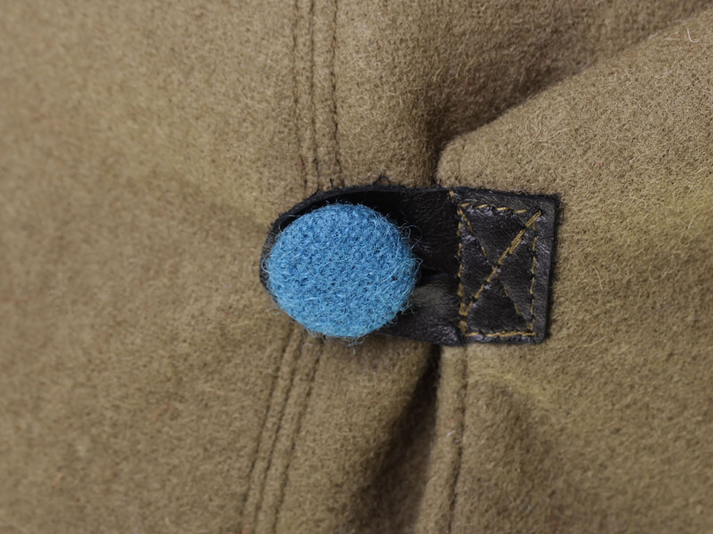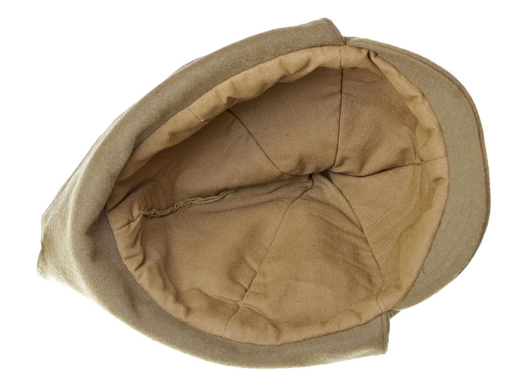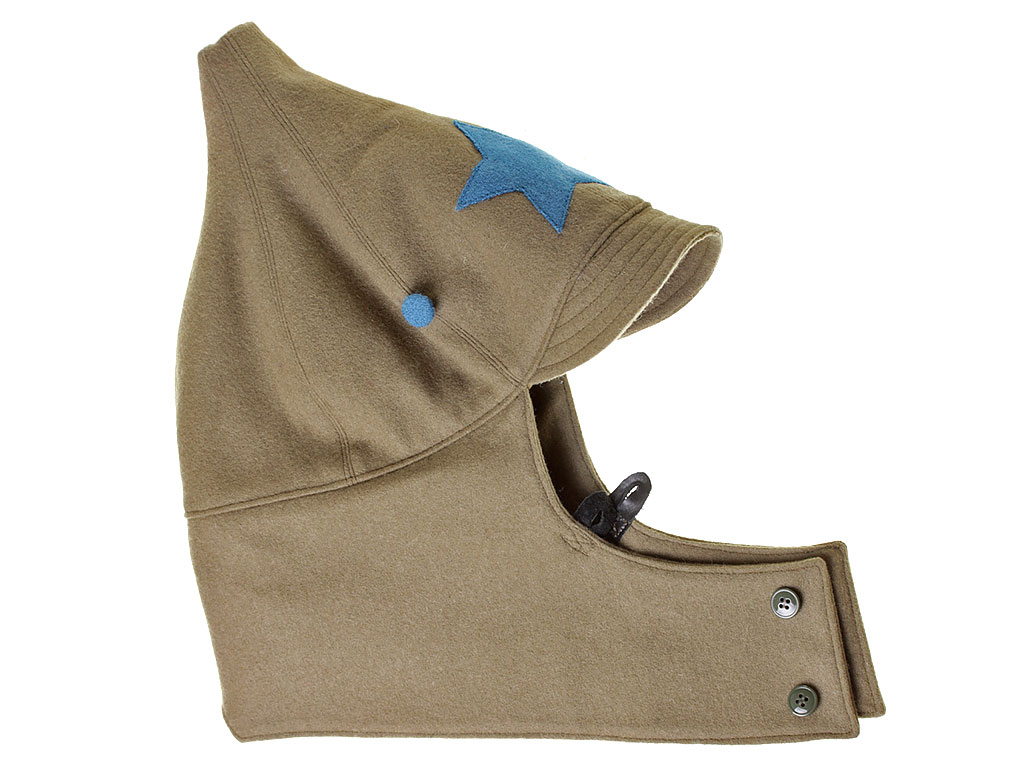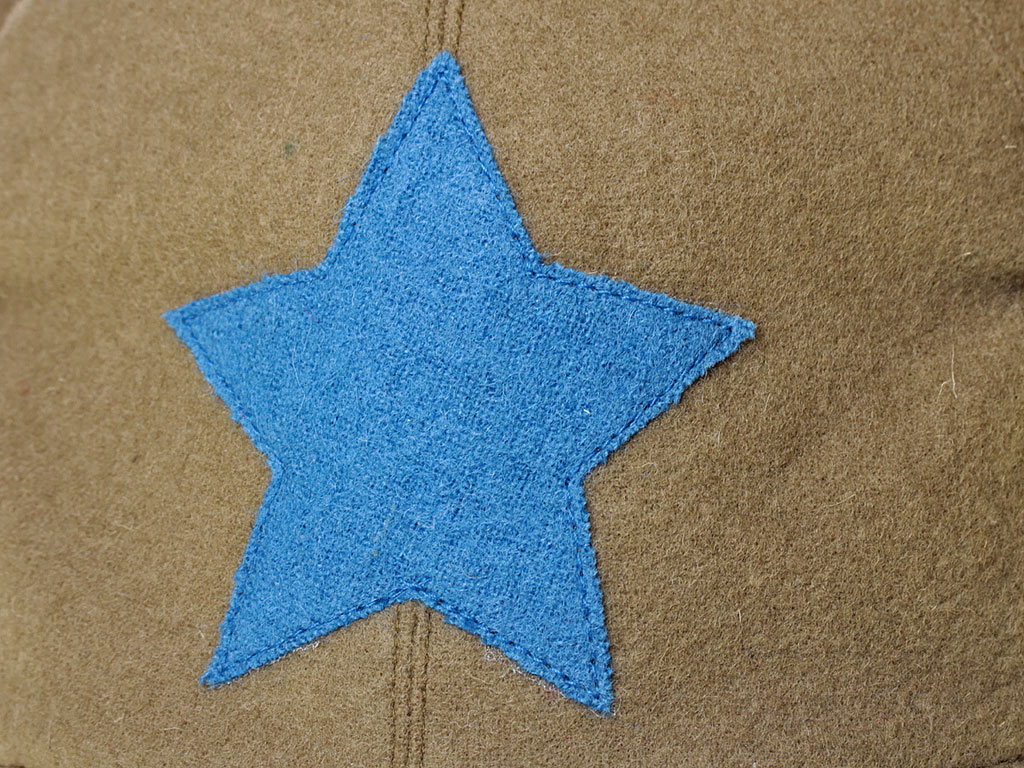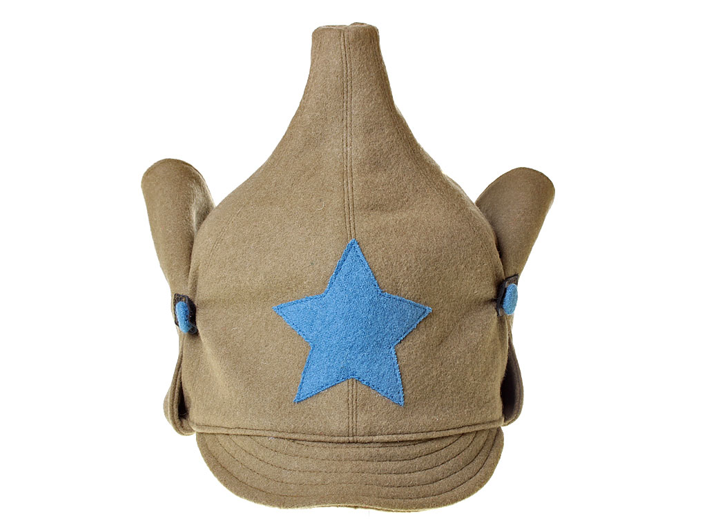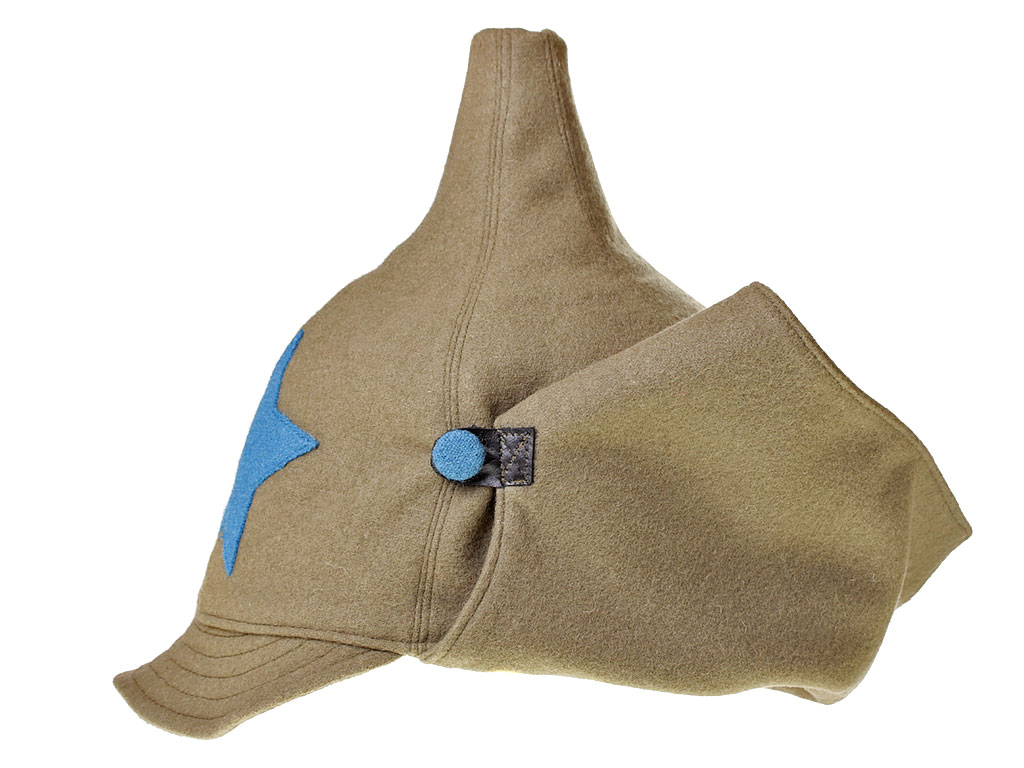 За образец при изготовлении представленного экземпляра была взята уставная зимняя (всесезонная) оригинальная командирская буденовка самого раннего типа, принятого в РККА. Шлем пошит из сукна защитного цвета и состоит из колпака, сужающегося кверху, и отгибающихся назатыльника и козырька. Колпак состоит из шести одинаковых кусков формы равнобедренного сферического треугольника, сшиваемых один с другим по боковым сторонам так, что вершины треугольников сходятся вверху в центре колпака. Спереди шлема нашита правильная пятиконечная звезда из приборного сукна присвоенного роду войск цвета: в представленном случае звезда из байковой ткани голубого цвета - красные военные летчики (красвоенлёты, как называли их в то время благодаря "моде" на сокращения слов). Металлическая звездочка на такие шлемы устанавливалась самого раннего типа, принятого в РККА (с изображением скрещенных плуга и молота) - стоит отметить, что чаще всего в то время буденовка носилась без металлической звезды. Подкладка под шлем - из хлопчатобумажной ткани.