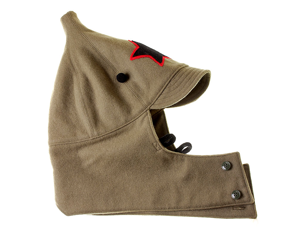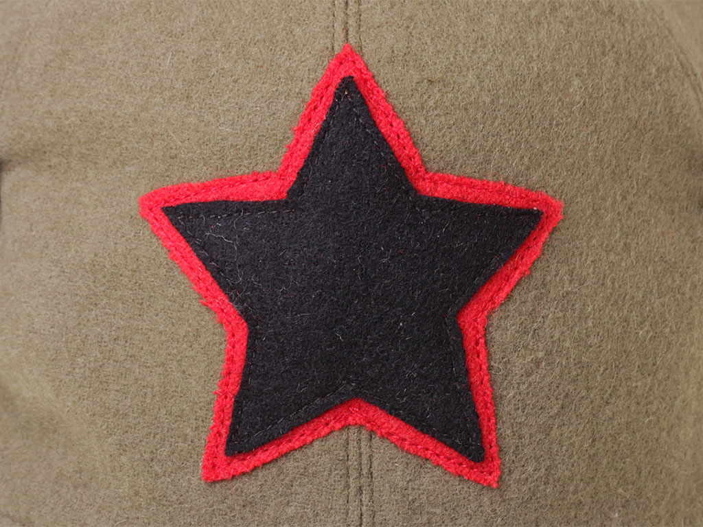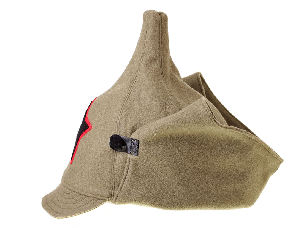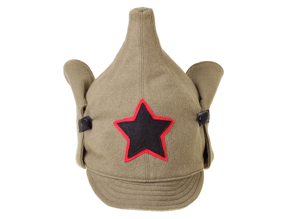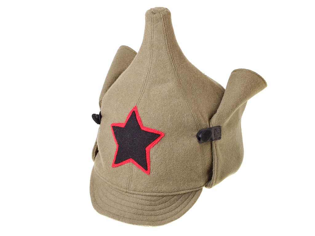 За образец при изготовлении представленного экземпляра была взята уставная зимняя (всесезонная) оригинальная командирская буденовка самого раннего типа, принятого в РККА. Шлем пошит из сукна защитного цвета и состоит из колпака, сужающегося кверху, и отгибающихся назатыльника и козырька. Колпак состоит из шести одинаковых кусков формы равнобедренного сферического треугольника, сшиваемых один с другим по боковым сторонам так, что вершины треугольников сходятся вверху в центре колпака. Спереди шлема нашита правильная пятиконечная звезда из приборного сукна присвоенного роду войск цвета: в представленном случае звезда из байковой ткани черного цвета с красным кантом. Металлическая звездочка на такие шлемы устанавливалась самого раннего типа, принятого в РККА (с изображением скрещенных плуга и молота) - стоит отметить, что чаще всего в то время буденовка носилась без металлической звезды. Подкладка под шлем - из хлопчатобумажной ткани.