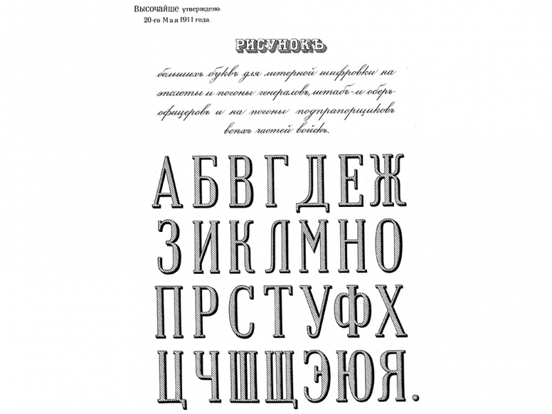 Предписывалась высочайшим императорским указом для ношения на погонах офицеров при походной форме, начиная 1914 года. На практике в начале войны это не всегда исполнялось, и многие офицеры щеголяли с золотыми погонами, что стоило больших потерь ранеными и убитыми, только к 1915-16 году распространение получили полевые погоны с черными"воронёными" цифрами и прочими знаками. На сегодняшний день эта хорошая для маскировки традиция, придуманная русским военным министерством, сохранилась в армии США.
