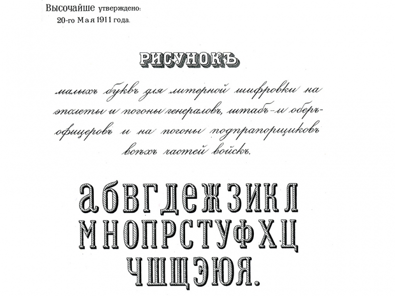 Предписывалась высочайшим императорским указом для ношения на погонах офицеров при походной форме, начиная 1914 года. На практике в начале войны это не всегда исполнялось, и многие офицеры щеголяли с золотыми погонами, что стоило больших потерь ранеными и убитыми, только к 1915-16 году распространение получили полевые погоны с черными"воронёными" цифрами и прочими знаками. На сегодняшний день эта хорошая для маскировки традиция, придуманная русским военным министерством, сохранилась в армии США.