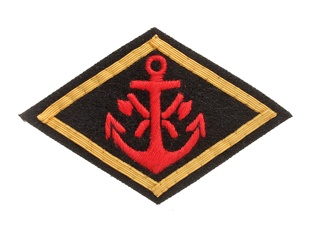 Нарукавный ромб для начальствующего состава размером 10 х 7 см из материала цвета обмундирования, с вышитым в центре красными нитями изображением якоря с перекрещенными топорами, с окантовкой из золотого галуна, для ношения на левом рукаве. Копия высокого качества.
