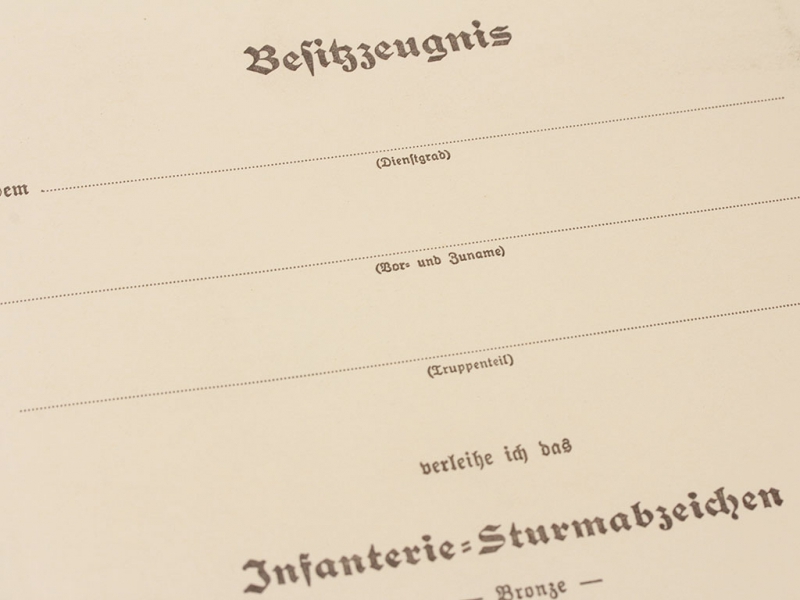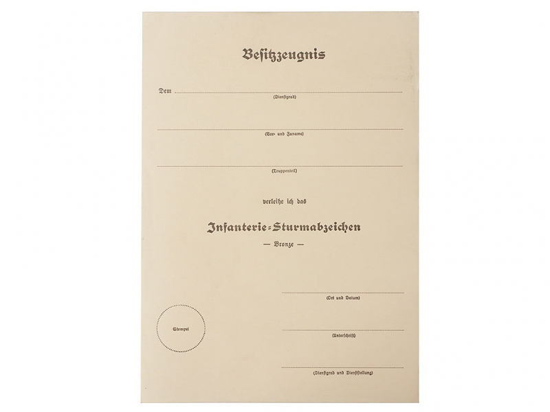 Наградной документ на пехотный штурмовой знак в бронзе, Германия