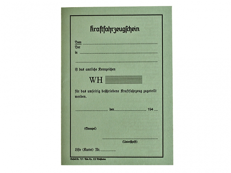 Свидетельство о регистрации транспортного средства для Вермахта (Kraftfahrzeugfchein), Германия, Копия