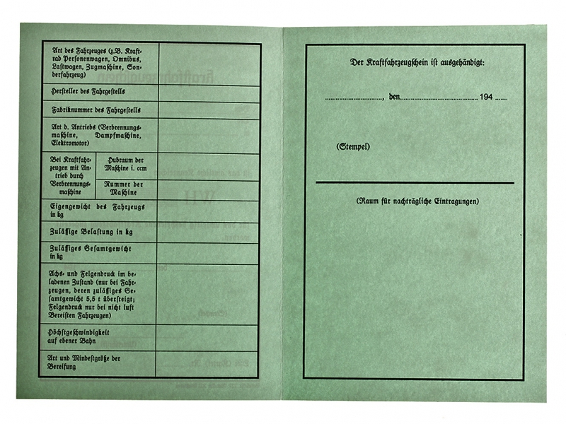 Документ о регистрации, в котором указывается подробная информация о транспортном средстве для Вермахта.