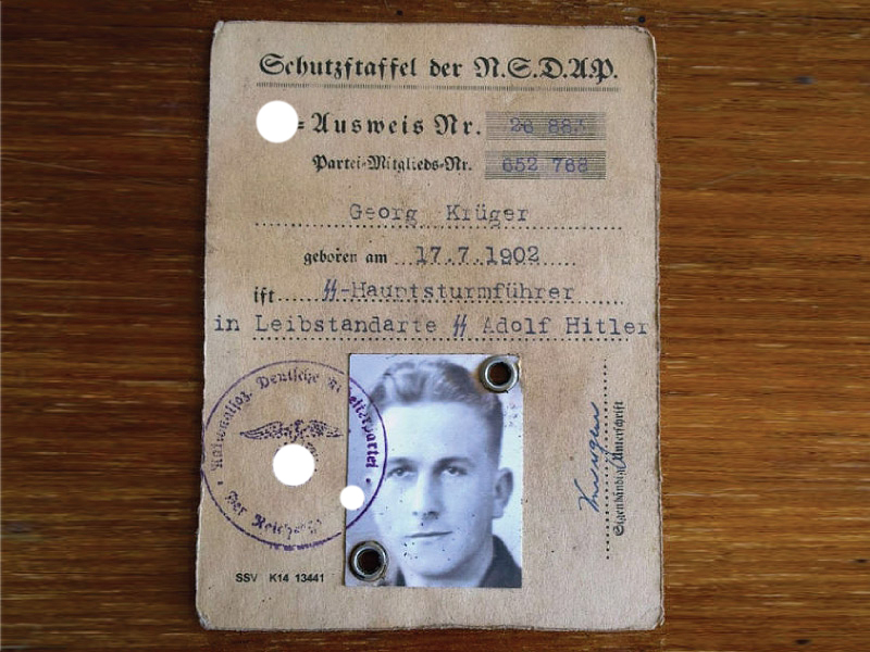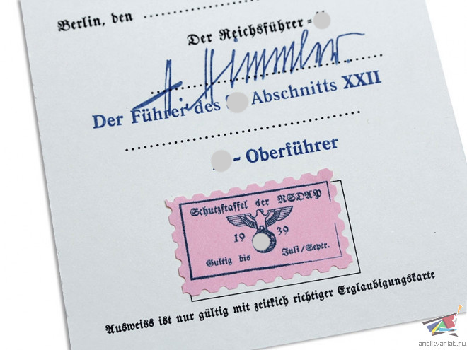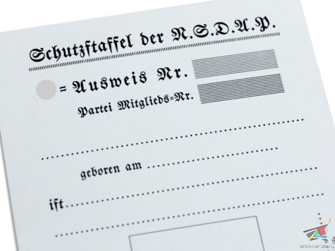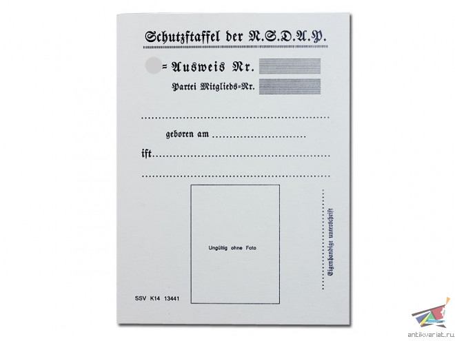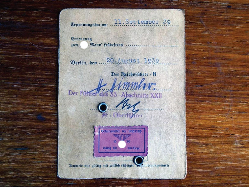 Копия высокого качества удостоверения личности члена "Защитных Отрядов" - СС (SS - Ausweis). Такие документы имели все члены рядового состава "Allgemeine-SS" ("Общих" СС), а также все бойцы ранних дивизий Ваффен-СС. Документ содержал персональные данные владельца, порядковый номер в организации SS и NSDAP, его фотографию (которая крепилась при помощи двух заклепок) и сбоку личную подпись рядом с фото, на оборотной стороне - подпись Рейхсфюрера СС Гиммлера (почти в 100% случаев факсимиле) и подпись командира подразделения, в котором служил владелец документа.