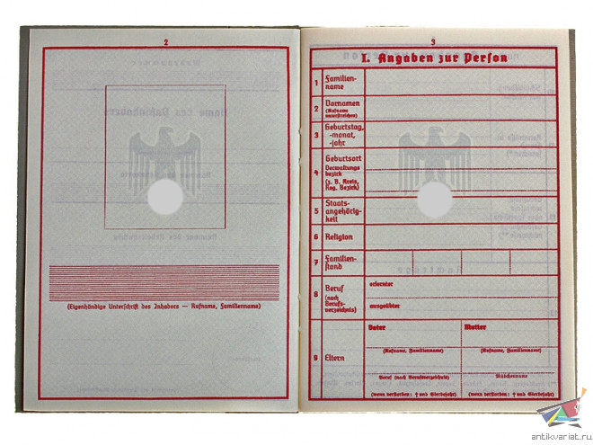 |Военный билет первого типа (орел с опущенными крыльями), Германия, Копия