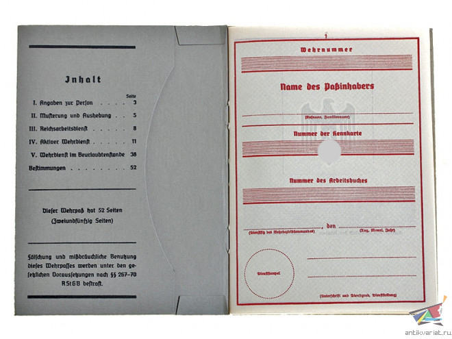 Военный билет первого типа (орел с опущенными крыльями), Германия, Копия